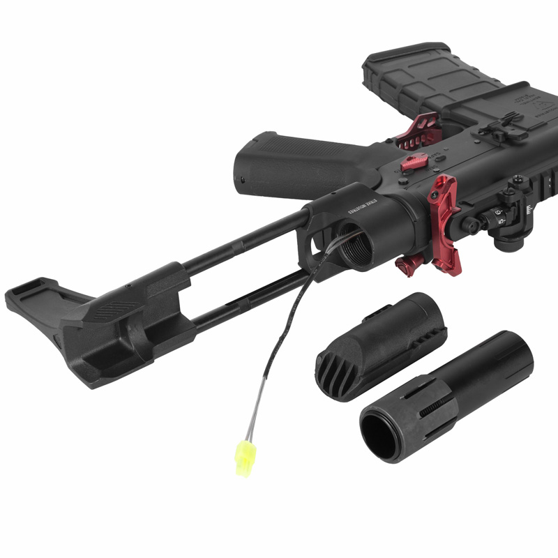 Аккумуляторный отсек размещается в прикладе, проводка на Mini-Tamiya. В комплекте идёт бункерный магазин на 300 шаров.