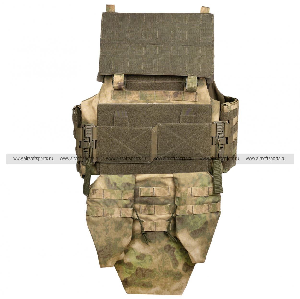 На переднем чехле предусмотрена сменная панель для снаряжения, которая крепится на велкро и двух фастексах. Её можно быстро заменить на аналогичную панель с другой раскладкой.