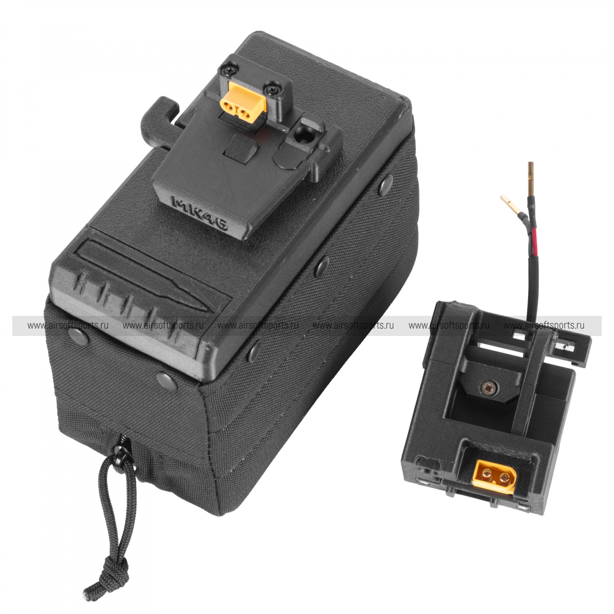 Короб работает автономно и не требует подключения к электрической цепи пулемета; для питания самого пулемета при необходимости можно установить дополнительный аккумулятор и подключить желтый разъем с двумя проводами (+ и –), аналогично стандартному подключению батареи. Для питания короба используется разъем JST, при этом аккумулятора емкостью 300 mAh хватает примерно на 20 000 выстрелов, что делает систему крайне экономичной и удобной в долгих играх. Емкость короба превышает 2400 шаров, в комплект входит вставка в пулемет (порядок установки показан на видео). Лента с муляжами патронов в комплект не входит.