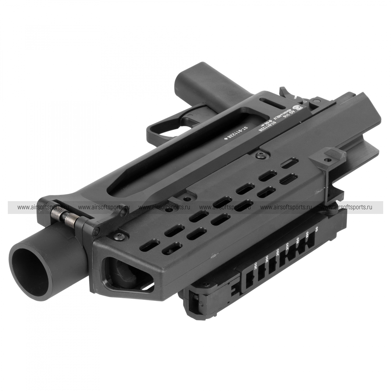 Гранатомёт выглядит строго и «по-военному»: массивный корпус в матовом чёрном исполнении, характерный цилиндрический ствол 40 мм и перфорированные элементы сверху, визуально перекликающиеся со стилем G36/G316. Спусковой крючок расположен в отдельной скобе, а пистолетная рукоять имеет выраженную текстуру и удобную форму. На боковой стороне заметны маркировки и компактные элементы управления, а общий дизайн собранный и аккуратный — после установки гранатомёт выглядит как штатный узел, а не сторонний аксессуар.