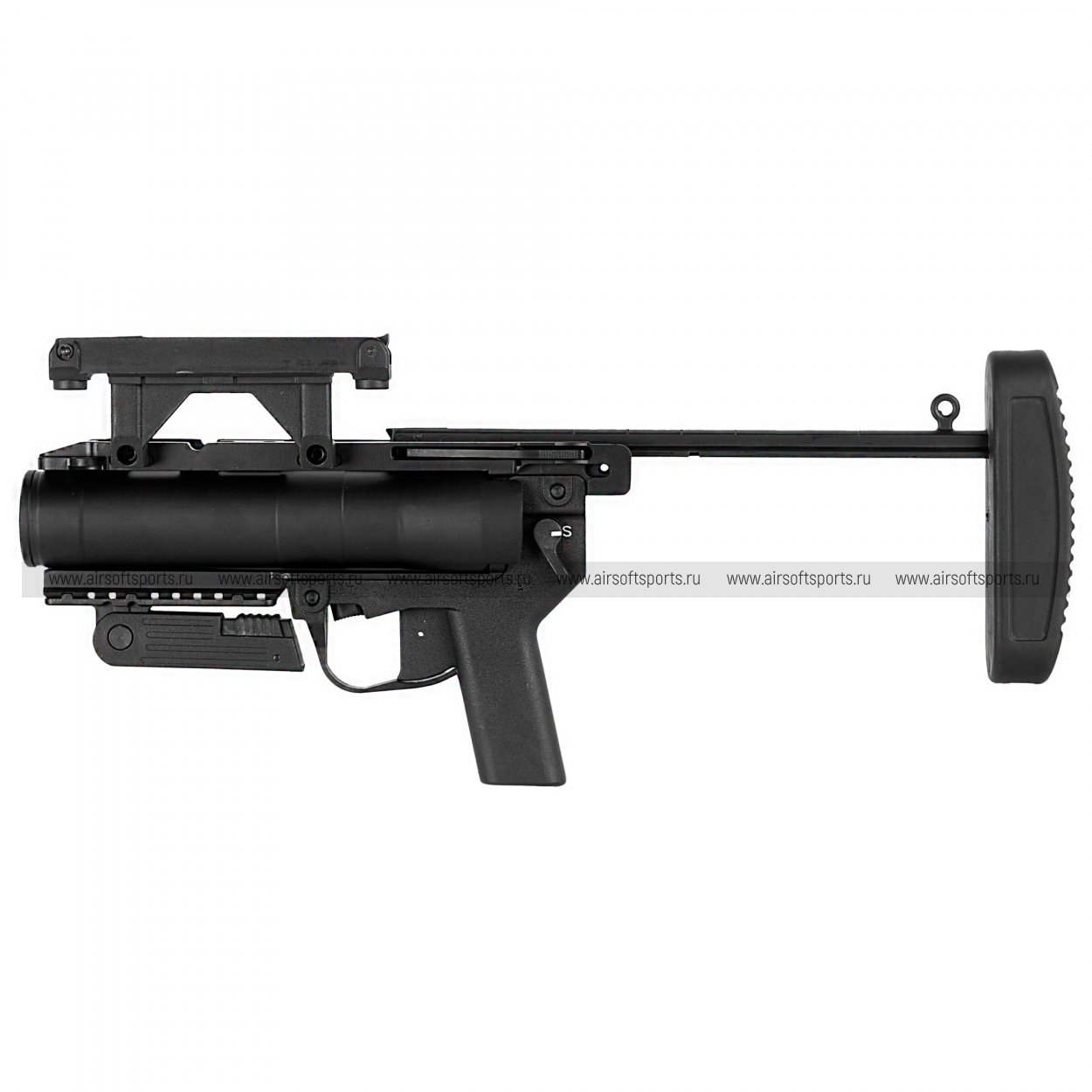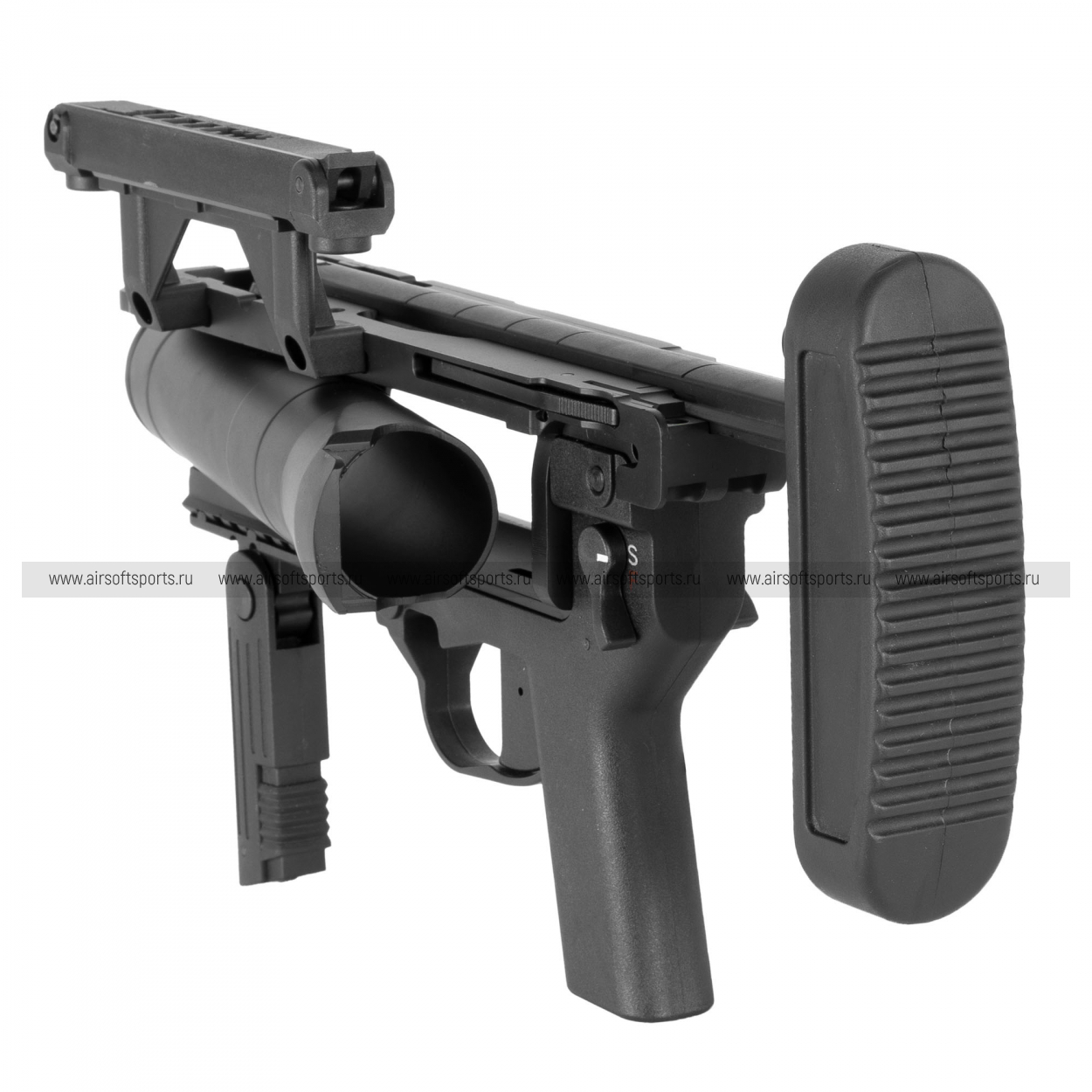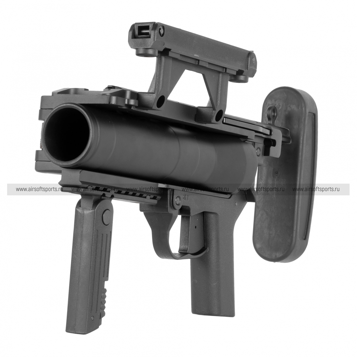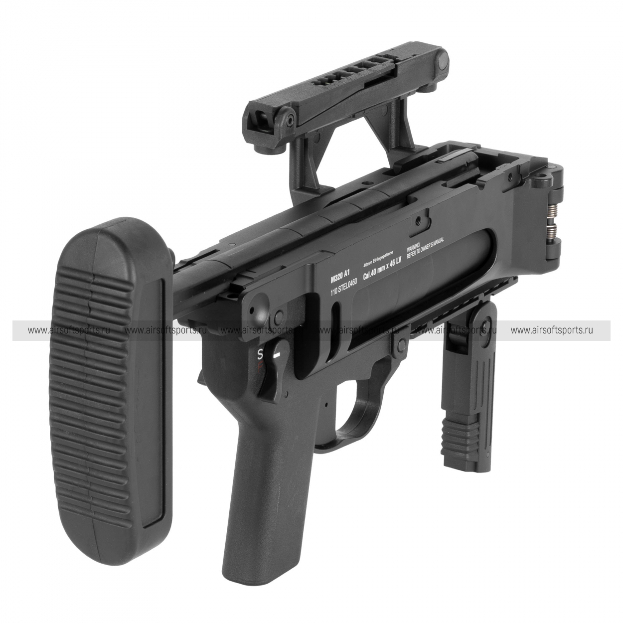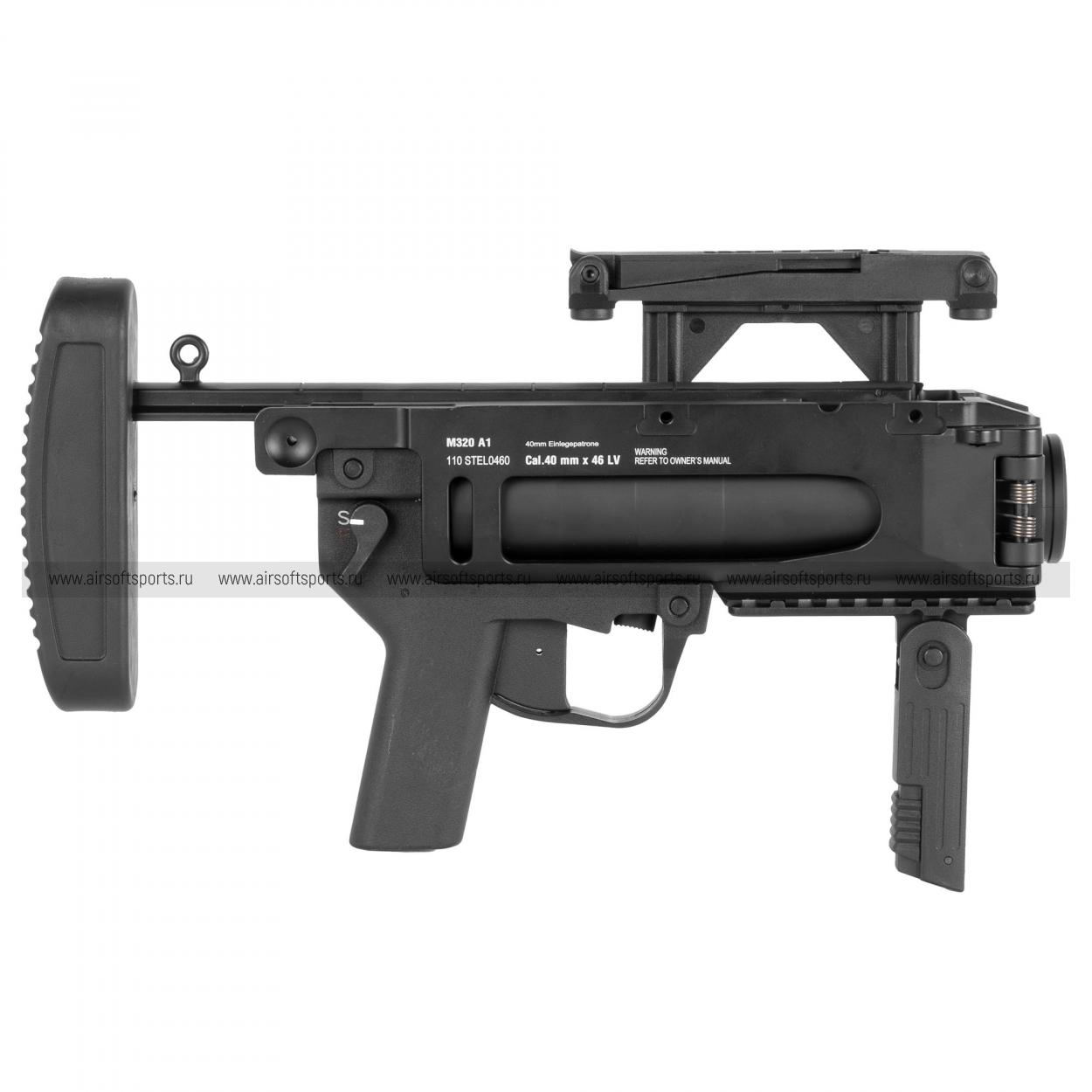 S&T M320 выполнен в строгом матовом чёрном цвете и выглядит очень «служебно» и современно. Центральный элемент — крупный 40‑мм ствол‑камора цилиндрической формы, вокруг которого собрана лаконичная рамная конструкция. Сверху расположена высокая планка Picatinny (под прицел/коллиматор), снизу — короткая рельса и складная передняя рукоять для более уверенного хвата. Сзади установлен приклад на штанге с массивным затыльником, который визуально балансирует конструкцию и делает её похожей на полноценное отдельное оружие, а органы управления (включая предохранитель) выполнены крупно и читаемо.