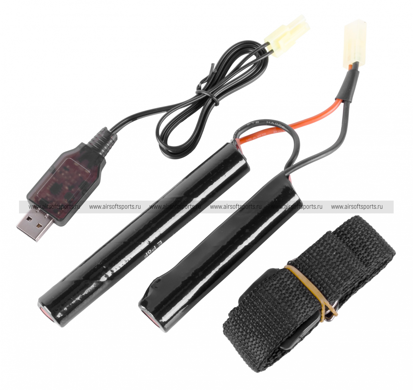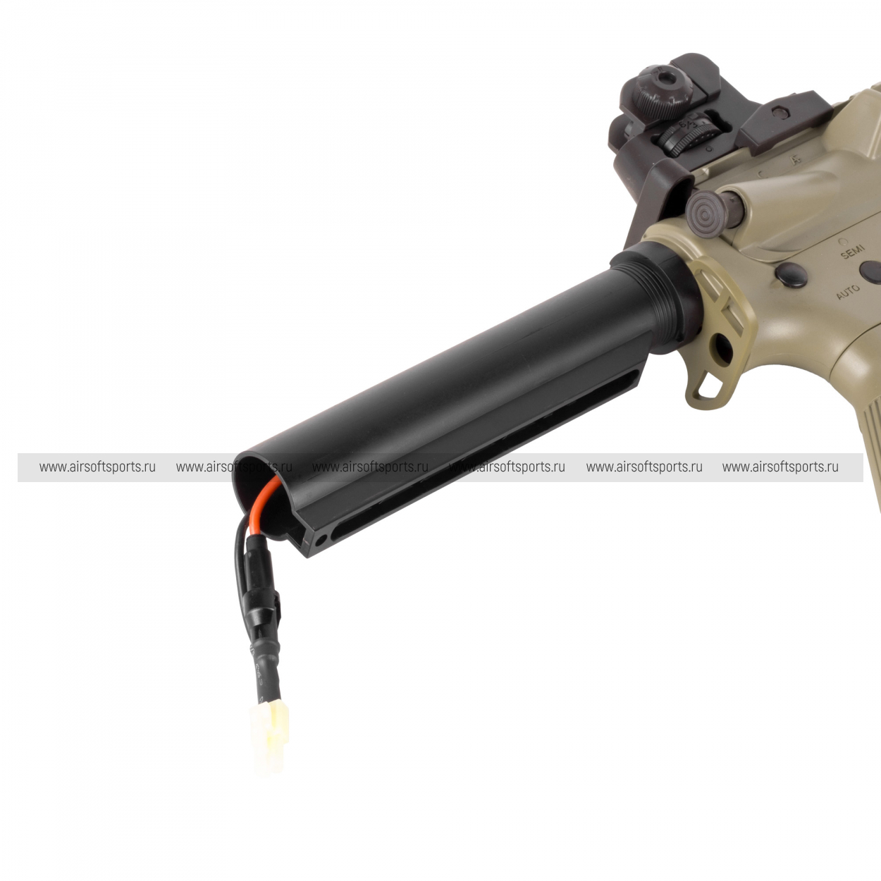Отсек для аккумулятора находится в прикладе. Внутри приклада достаточно свободного места для установки стандартных аккумуляторов AK-типа с разъемом mini-tamiya. Одного заряда аккумулятора хватает на несколько часов работы.