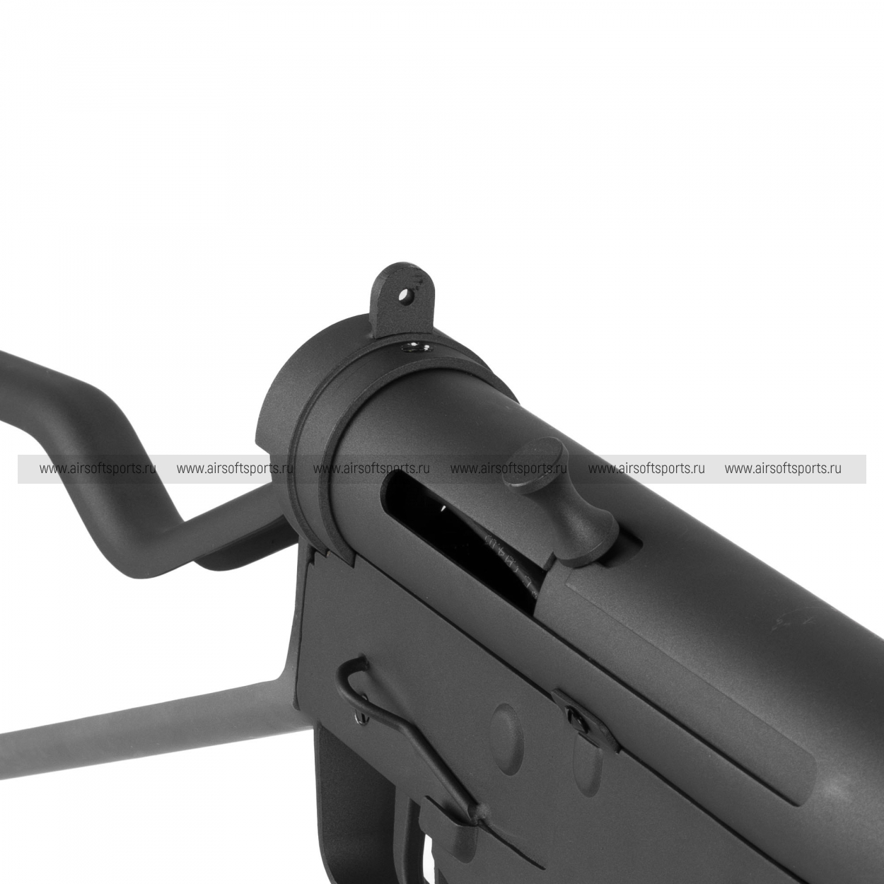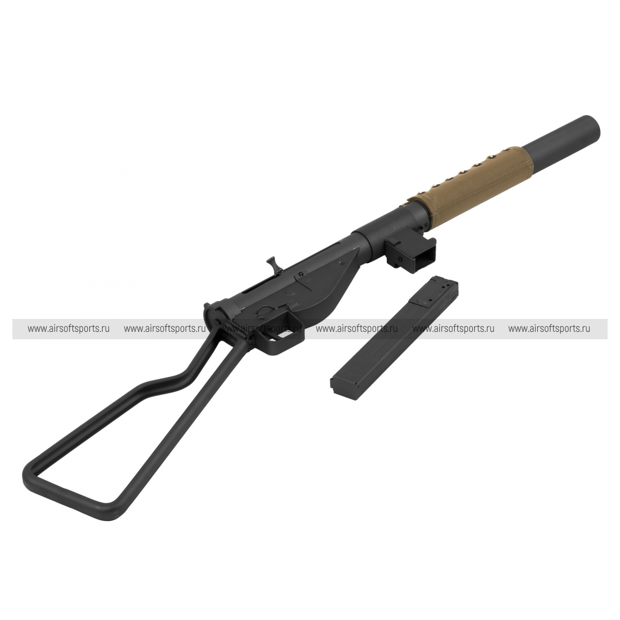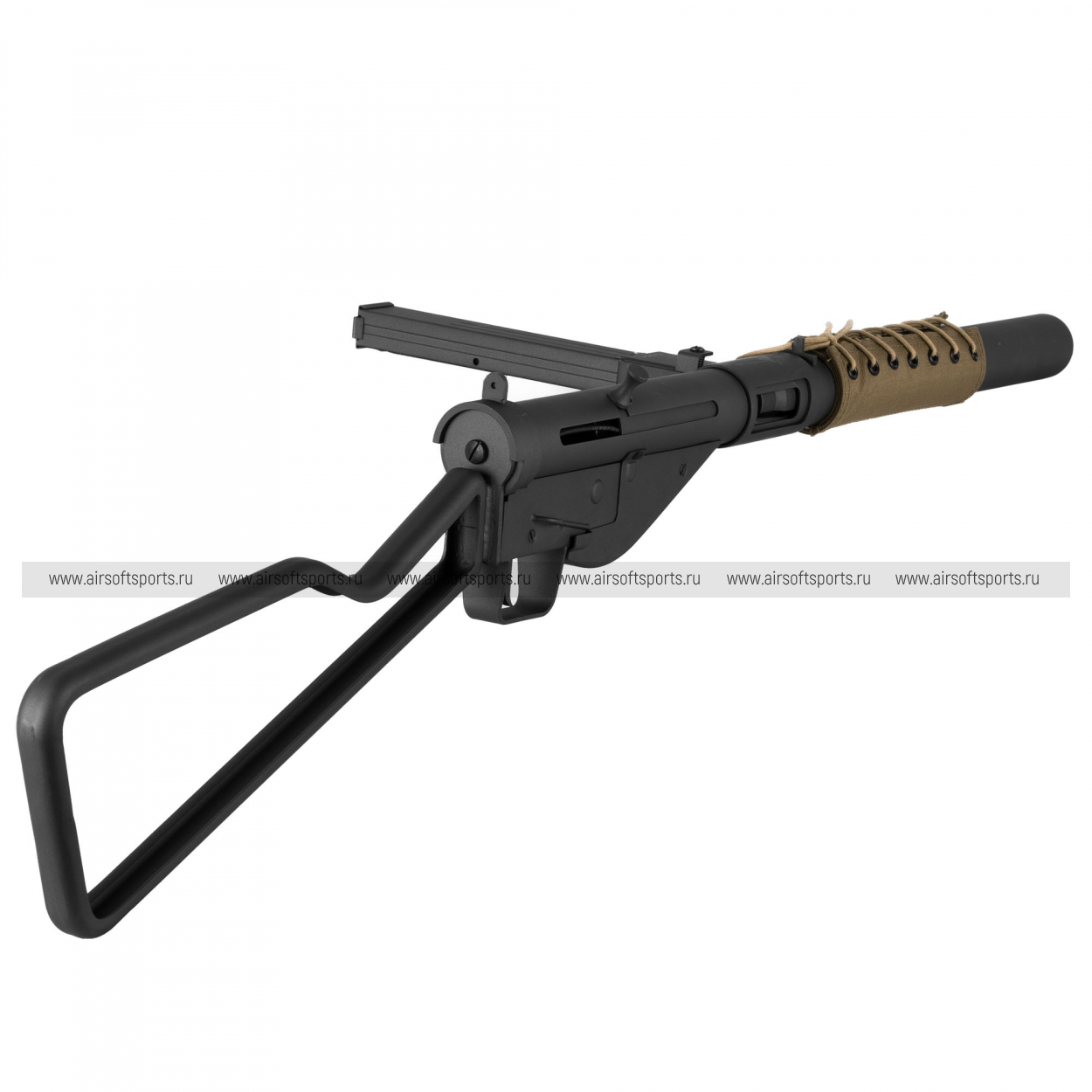 Внешне это очень аутентичный STEN: трубчатая ствольная коробка и минимум деталей подчёркивают его утилитарный «военный» характер. Спереди установлен удлинённый глушитель, из-за которого модель выглядит более цельной и вытянутой, а на нём — тканевый/канвасный чехол с шнуровкой, добавляющий реконструкторской атмосферы. Магазин расположен слева, что сразу узнаваемо и визуально делает оружие «несимметричным». Сзади — характерный проволочный приклад Loop Stock в виде крупной рамки: лёгкий на вид, простой и очень «стеновский», он завершает образ максимально лаконичного оружия без лишнего тюнинга.