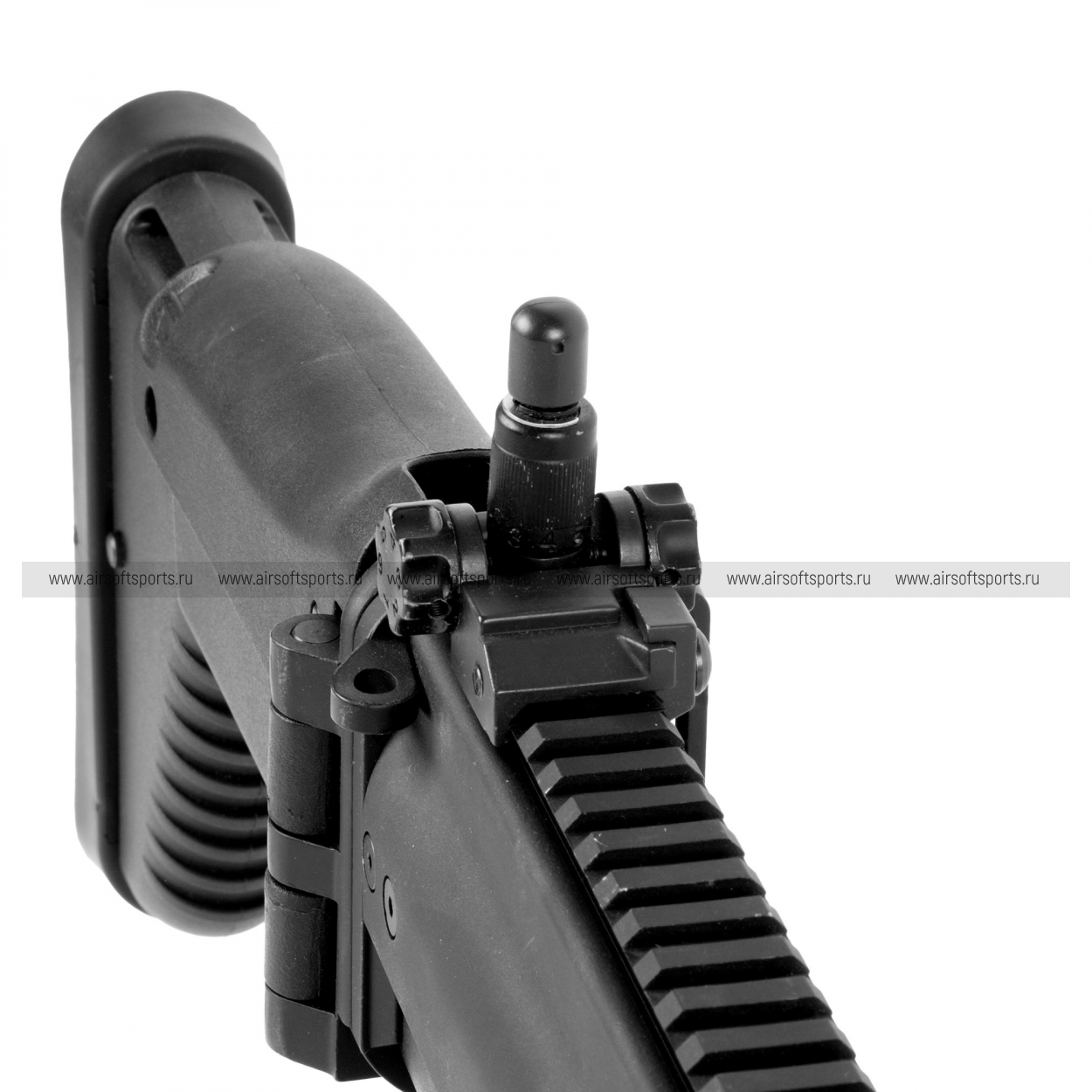 Приклад складной и регулируемый по длине, что позволяет адаптировать автомат под индивидуальные предпочтения пользователя и условия игры. На прикладе и рукоятке предусмотрены эргономичные насечки для надежного хвата. Цвет корпуса — классический матовый черный или песочный (в зависимости от версии), что подчеркивает тактический стиль и универсальность модели.
