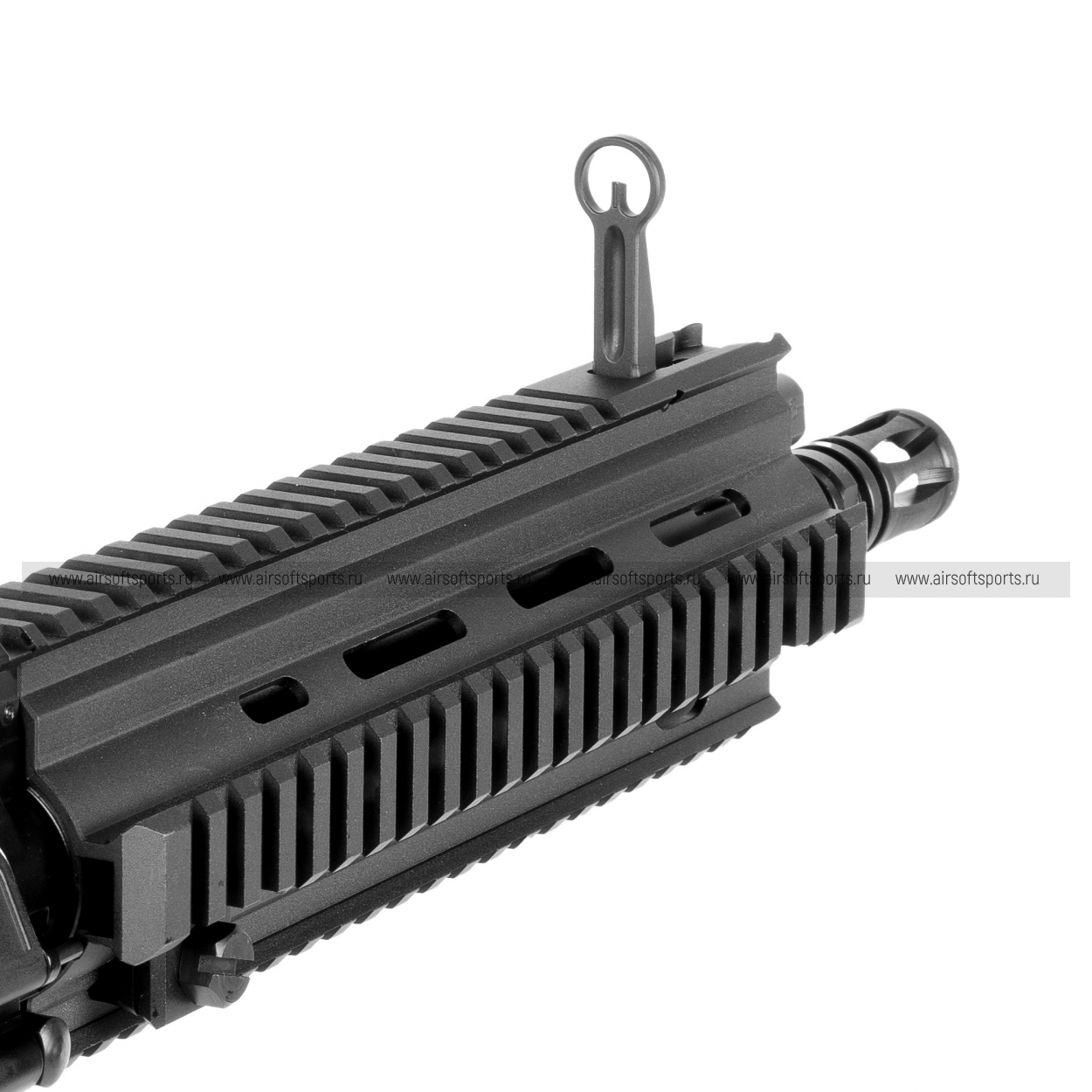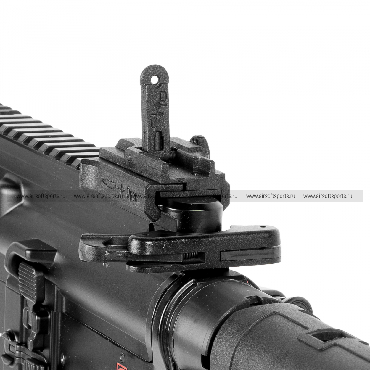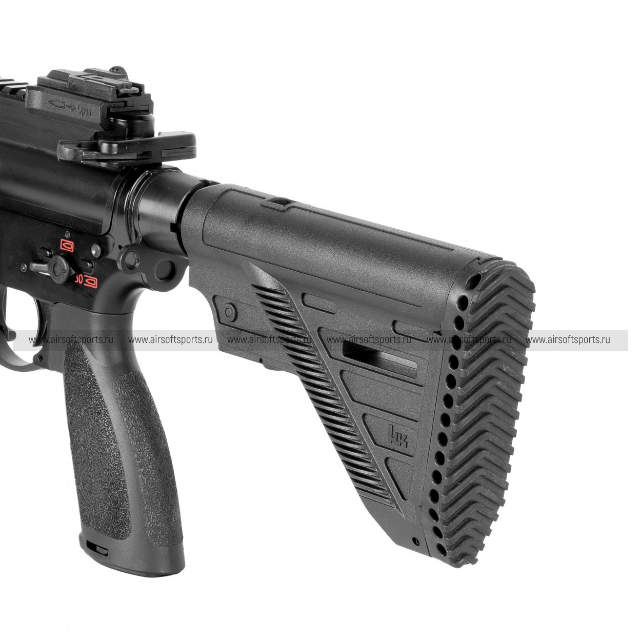 Сзади стоит полимерный PDW-приклад, установленный на 5-позиционную трубу (metal buffer tube) — он подчёркивает компактность и делает внешний вид ближе к CQB/PDW-стилю. Рукоять пистолетная — полимерная. Много элементов управления и деталей выполнено из металла: спуск/скоба, переводчик (двусторонний), затворная задержка, кнопка сброса магазина, двусторонняя рукоятка взведения. Дополняют реалистичность передняя/задняя антабки, «газ-блок» (декоративный/имитационный узел) и затворная группа с маркировкой “HK”. Пылезащитная крышка выполнена из полимера.