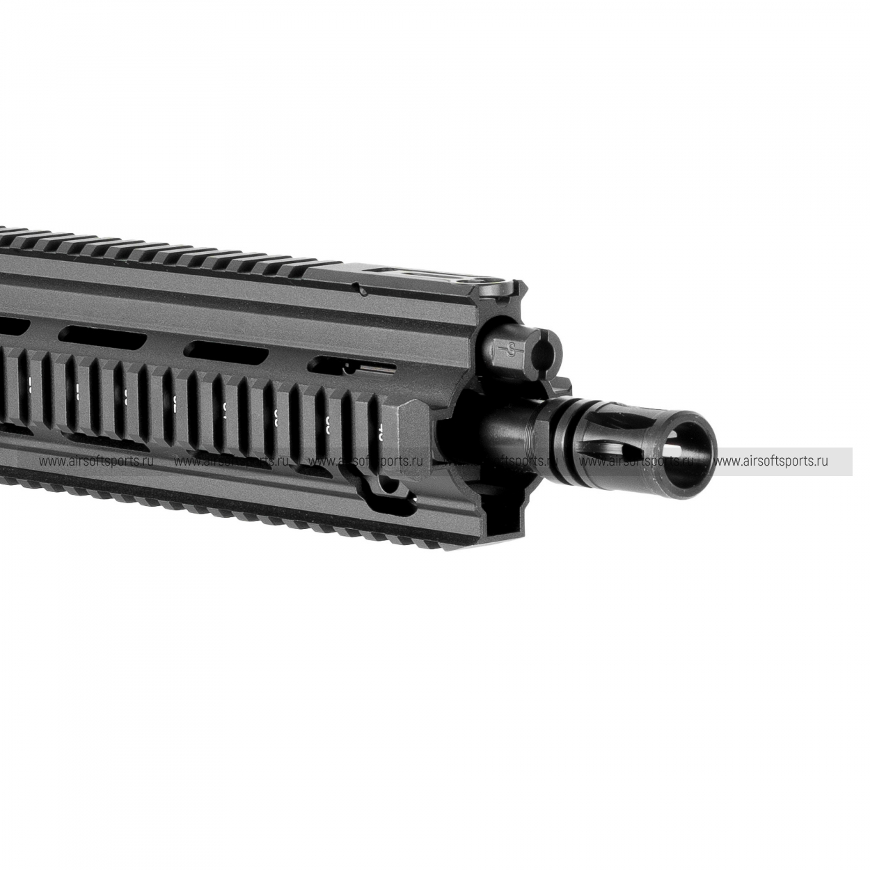 По внешности это максимально «тактический» и реалистичный HK416A5 в компактном формате. Основной визуальный акцент — полностью металлический ресивер с аутентичными гравировками “Heckler & Koch” и “HK416A5”, что сразу задаёт ощущение лицензированного продукта. Спереди установлен металлический free-float цевьё/handguard с планкой Picatinny (175 мм) — оно выглядит строго и функционально, рассчитано на фонари, рукояти, ЛЦУ и прочие аксессуары.