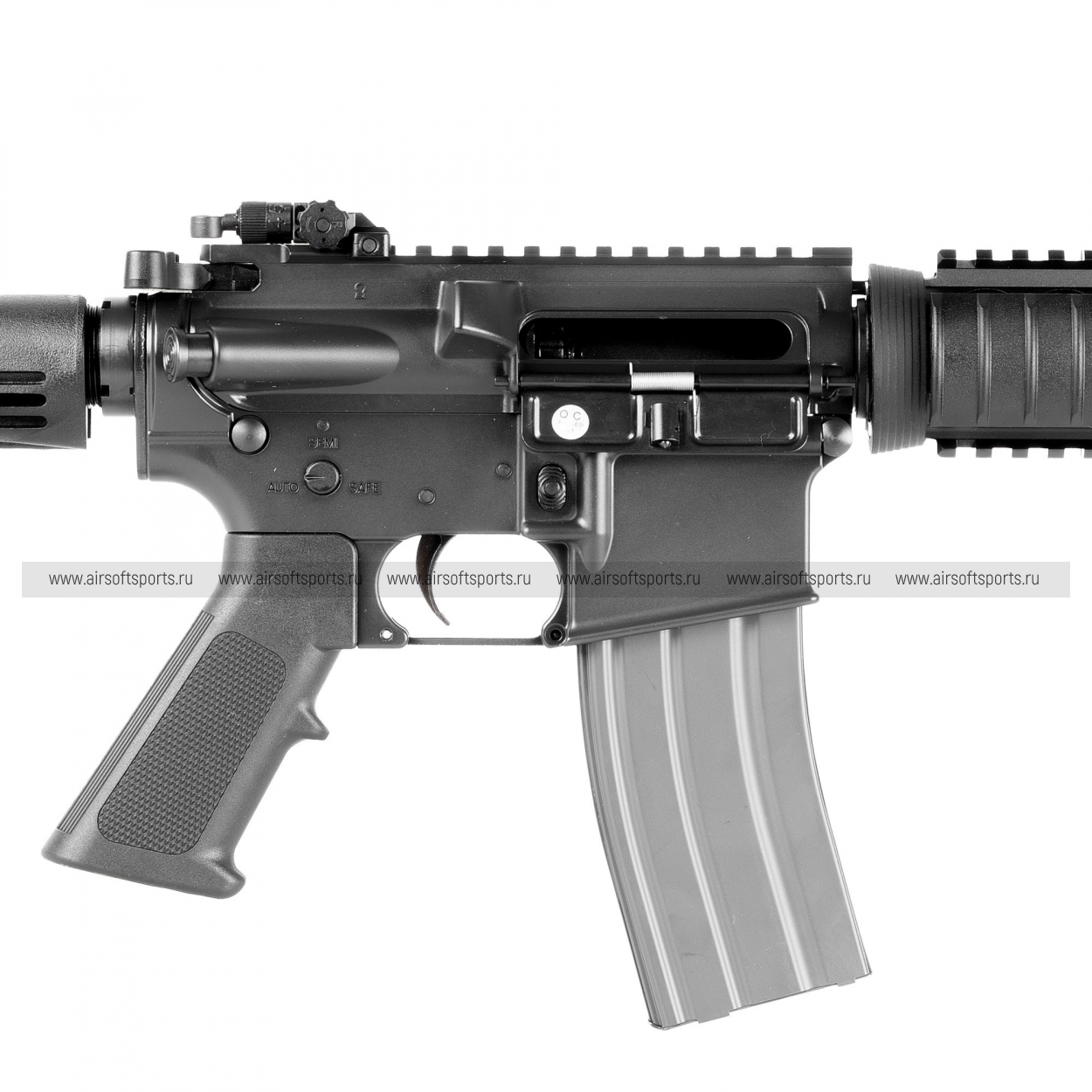 Пистолетная рукоять и спусковая зона выполнены в стандартной AR‑эстетике: всё выглядит знакомо и практично. Магазин — типичный STANAG‑формата, он завершает образ «натовского» карабина и визуально поддерживает реализм GBB‑платформы (обычно такие магазины заметно массивнее, что также ощущается по внешнему виду).