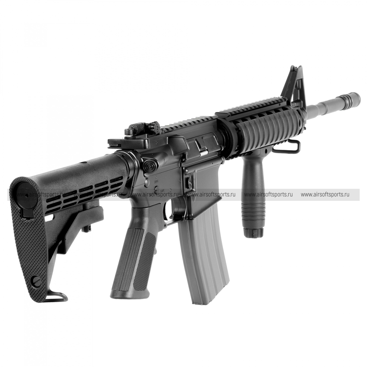 У M4A1 RIS внешний вид практически всегда подразумевает удобную установку прицела. Поэтому верхняя линия выглядит «ровной» и функциональной: карабин визуально просится под коллиматор, увеличитель, оптику или механические складные прицельные. Даже если прицел не установлен, сам характер верхней части подчёркивает модульность и современность.