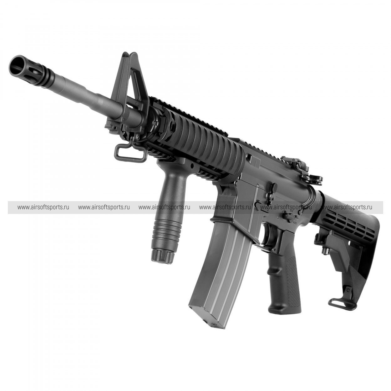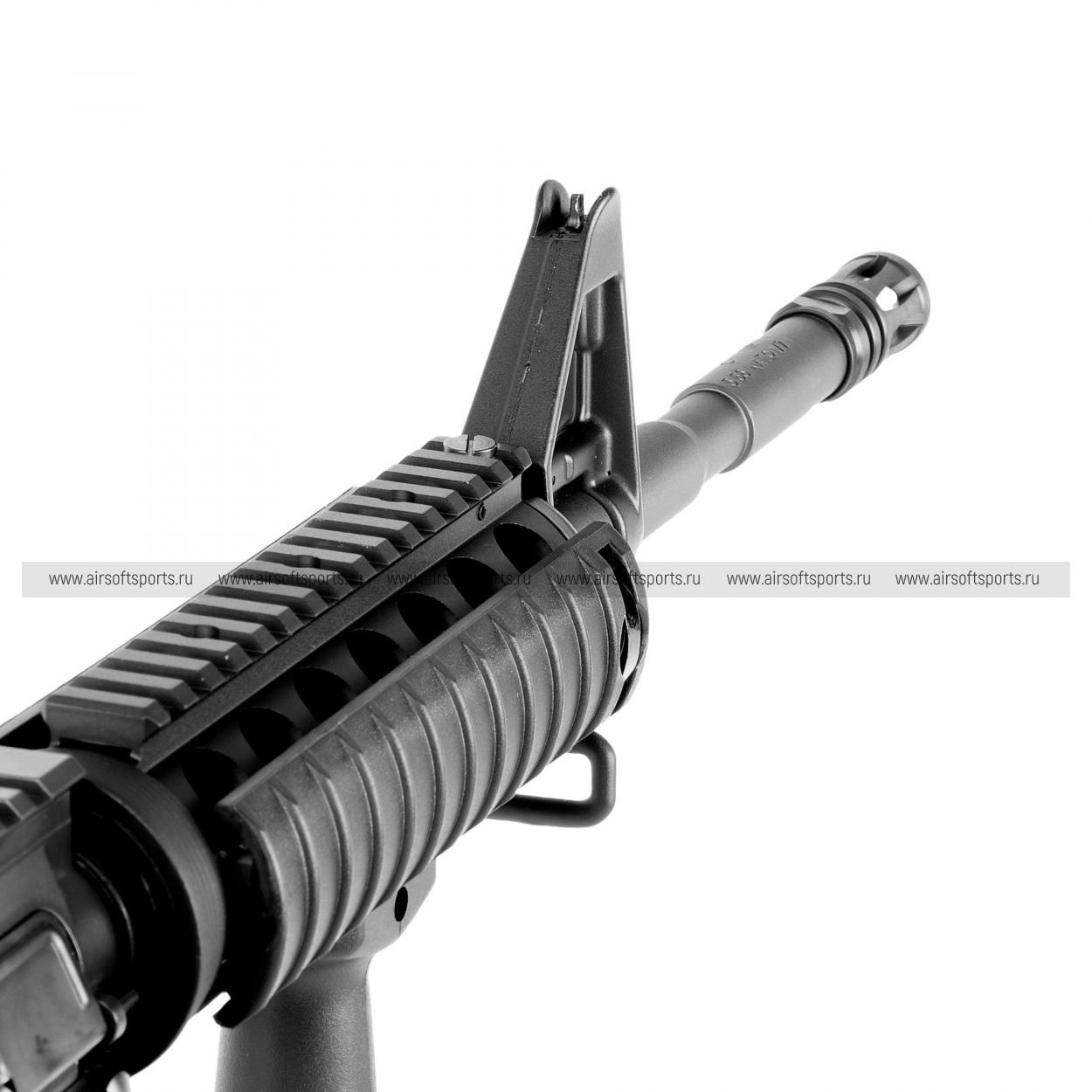 Передняя часть, как правило, выдержана в стиле M4A1: ствол средней длины для карабина, с аккуратной дульной зоной. На конце — стандартное дульное устройство «м4‑семейства» (обычно пламегаситель классического типа), которое завершает образ современного служебного оружия. В зависимости от конкретной конфигурации может сохраняться классическая передняя стойка (A‑frame) либо низкопрофильный газблок под установку передних прицельных решений — но общий внешний посыл остаётся один: универсальный карабин, готовый к тюнингу.