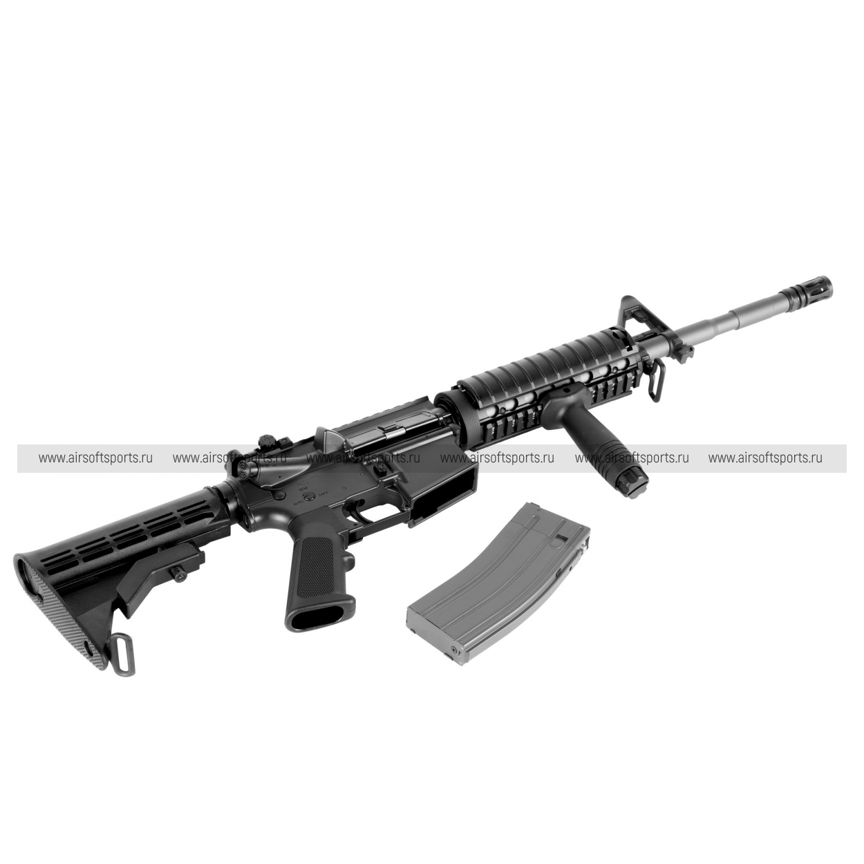 Внешне это классический M4A1 в современном исполнении: компактный карабин с прямыми линиями ресивера, выраженной «тактической» передней частью и стандартной эргономикой AR‑платформы. Визуально модель воспринимается более «боевой» и утилитарной, чем ретро-версии: здесь преобладают ровные плоскости, угловатые формы и функциональные элементы для установки навесного оборудования.