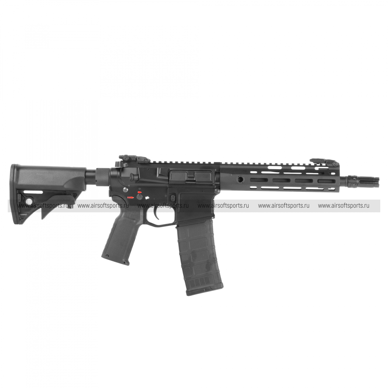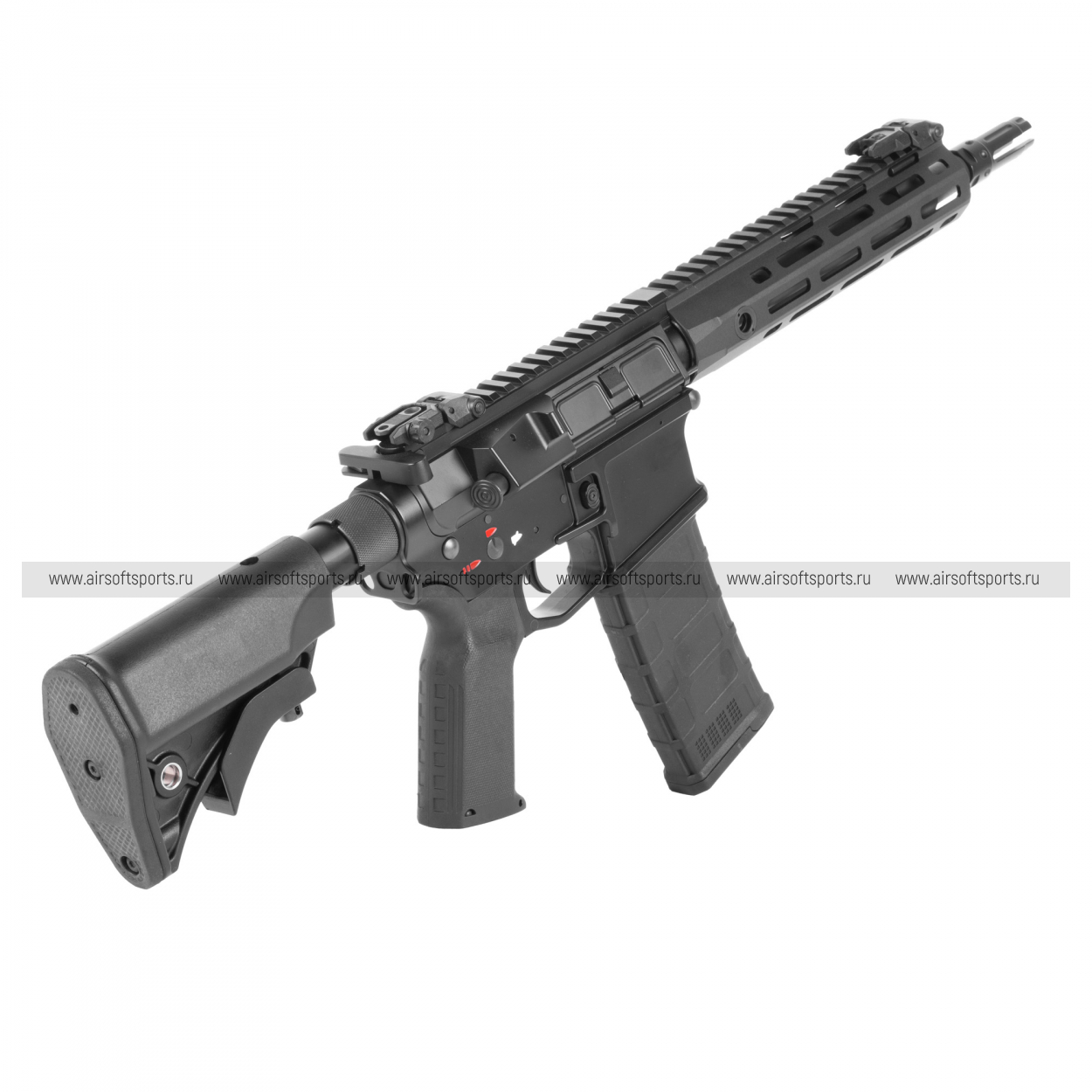 CM097F выполнен в сдержанной современной эстетике AR‑платформы: матово‑чёрные металлические ресиверы с аккуратной фаской шахты магазина и непрерывная верхняя планка Picatinny переходят в узкое 8‑дюймовое M‑LOK‑цевьё со скошенными гранями, придавая силуэту компактность и «быстрый» профиль. Наружный ствол уходит глубже под цевьё, на резьбе 14 мм CCW установлен современный пламегаситель/компенсатор, подчёркивающий тактичный характер модели. Рабочая пылезащитная крышка окна выброса и рукоятка взведения открывают доступ к регулировке хоп‑ап, присутствуют характерные элементы AR — отражатель, кнопка досылателя‑муляж. Телескопический приклад с несколькими положениями сохраняет общий компакт и баланс, в основании предусмотрены гнёзда под QD‑антабки; пистолетная рукоять с более вертикальным углом и цепкой текстурой обеспечивает уверенный хват. Ровные стыки, минимум лишних деталей и равномерное покрытие без глянца делают CM097F визуально аккуратным и агрессивным, идеально вписываясь в образ манёвренного CQB‑привода.