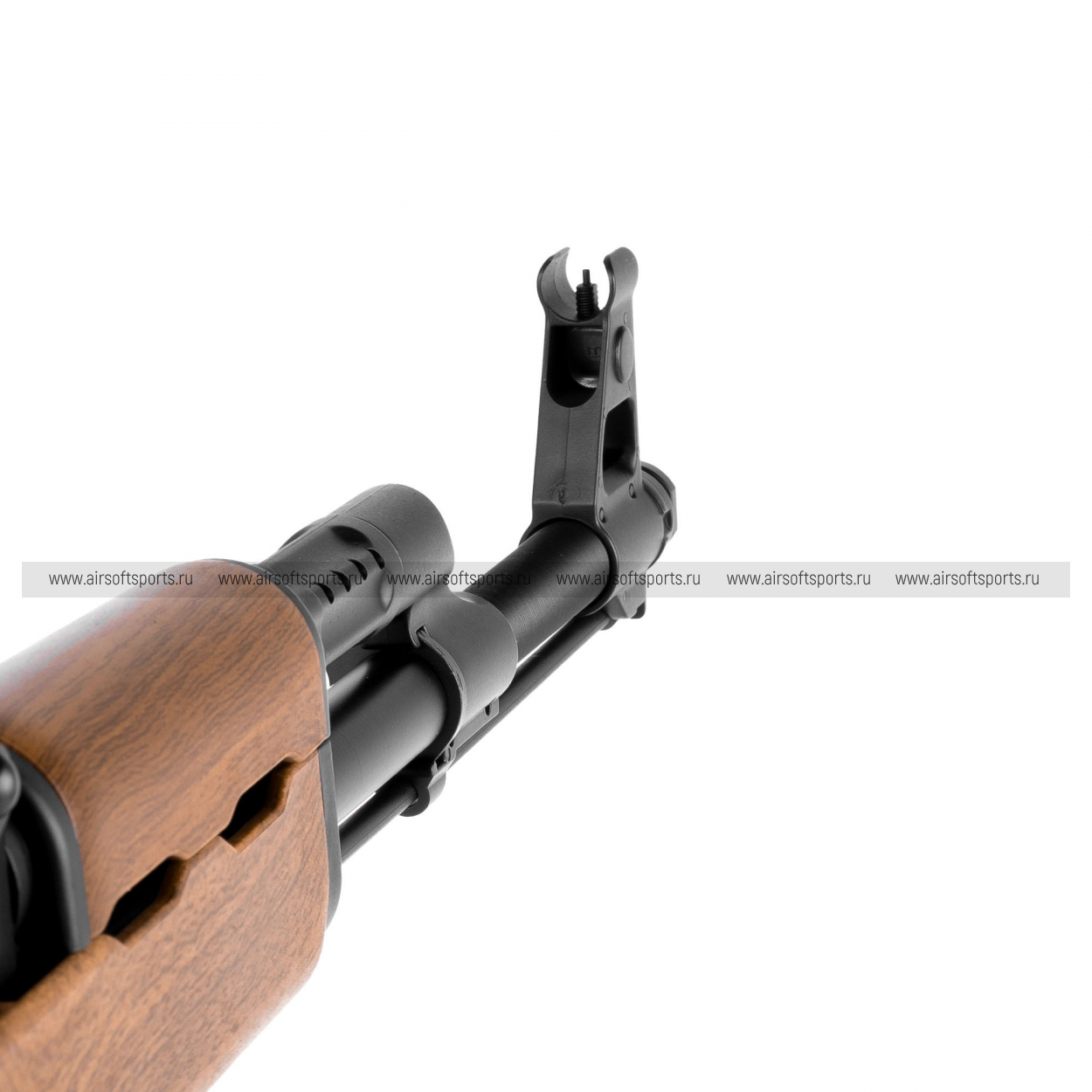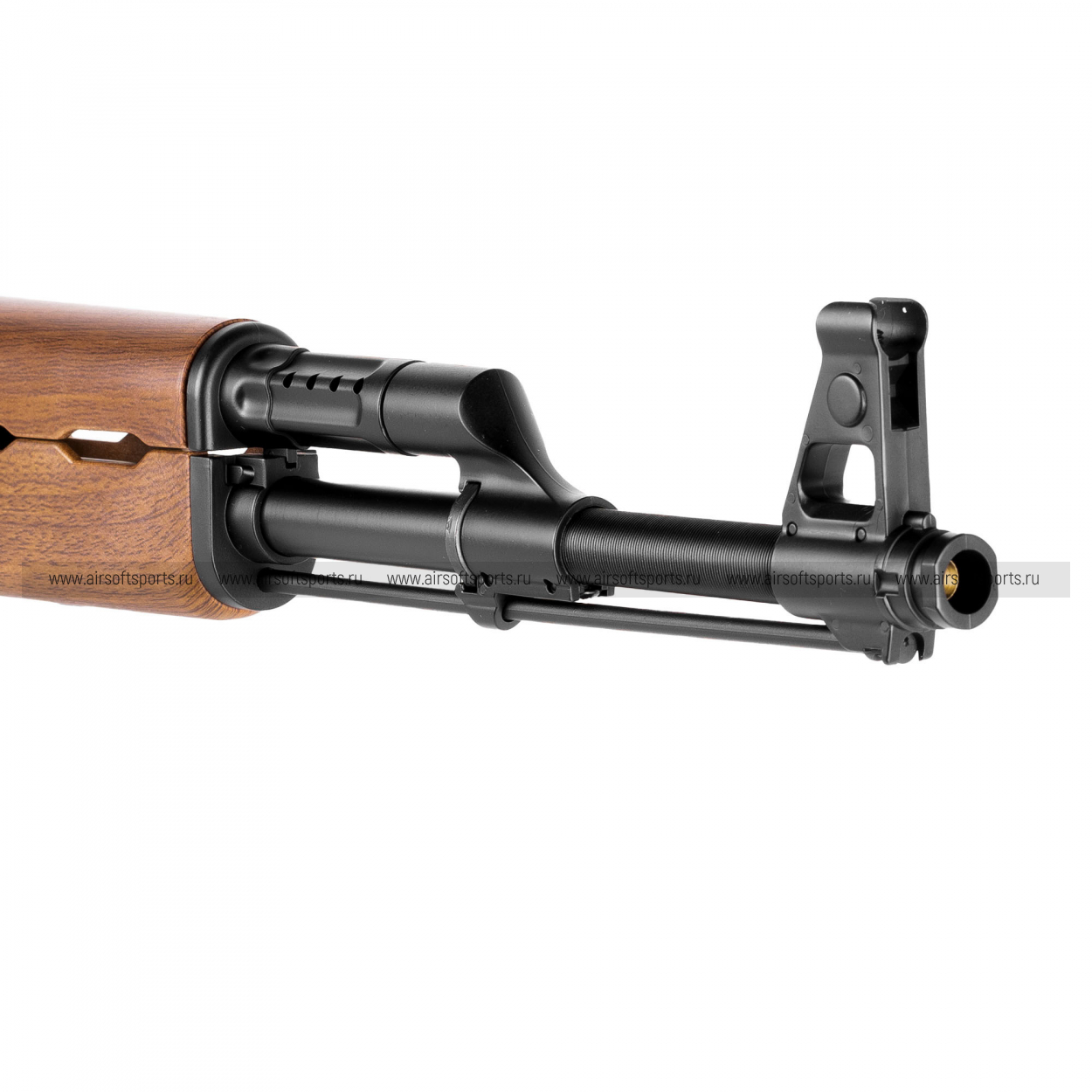 Автомат выполнен в контрастной классической расцветке: ствольная коробка, ствол и основные металлические на вид узлы — матово‑чёрные, а приклад, цевьё и пистолетная рукоять — коричневые «под дерево» с выраженной древесной текстурой. За счёт этого реплика сразу узнаётся как АК47 в традиционном исполнении.