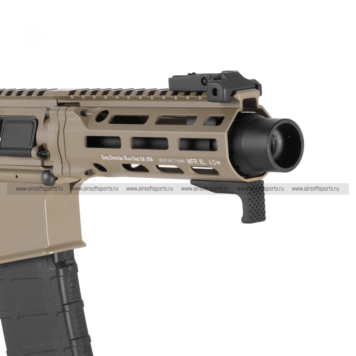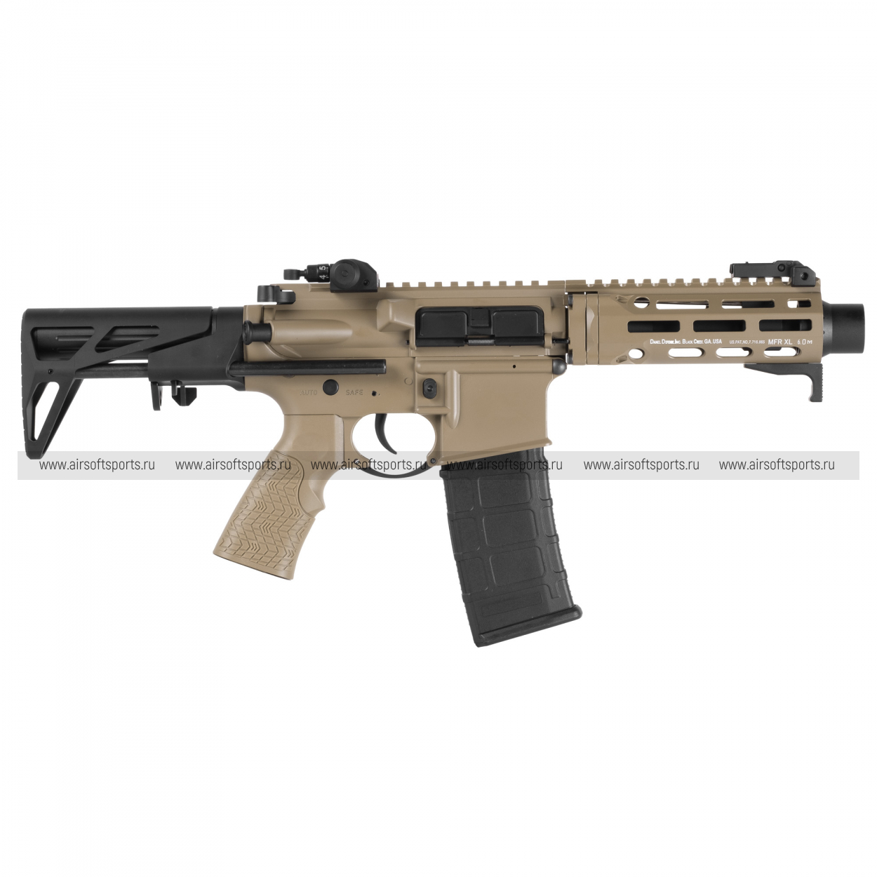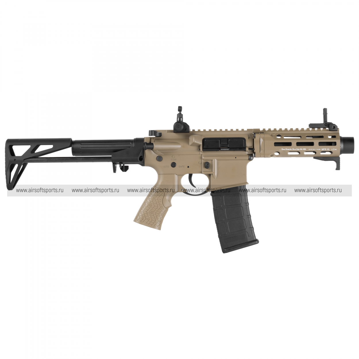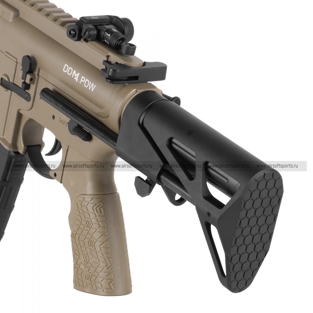 Корпус ресивера несет на себе аутентичные маркировки "DDM4 PDW", что добавляет модели реализма. Органы управления — предохранитель, кнопка сброса магазина и затворная задержка — расположены стандартно для платформы AR-15. Эргономичная пистолетная рукоятка имеет текстурированную поверхность для уверенного и комфортного хвата.