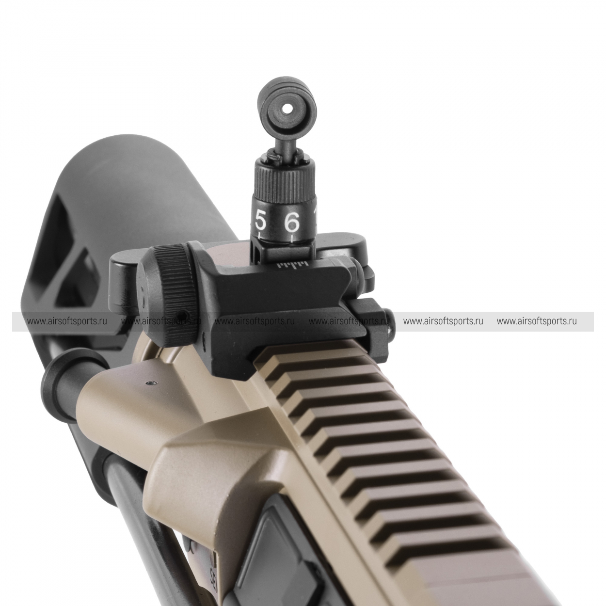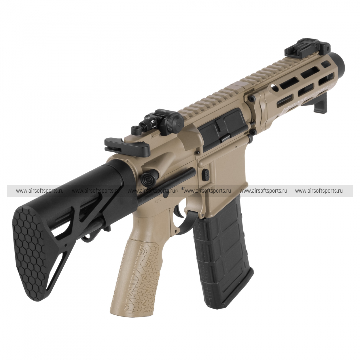 Завершает образ компактный телескопический приклад черного цвета. Его минималистичная конструкция с прорезями для облегчения веса позволяет быстро регулировать длину привода, адаптируя его под любого оператора и условия боя. В комплекте идет черный полимерный магазин с выразительной сотовой текстурой, улучшающей сцепление при перезарядке.