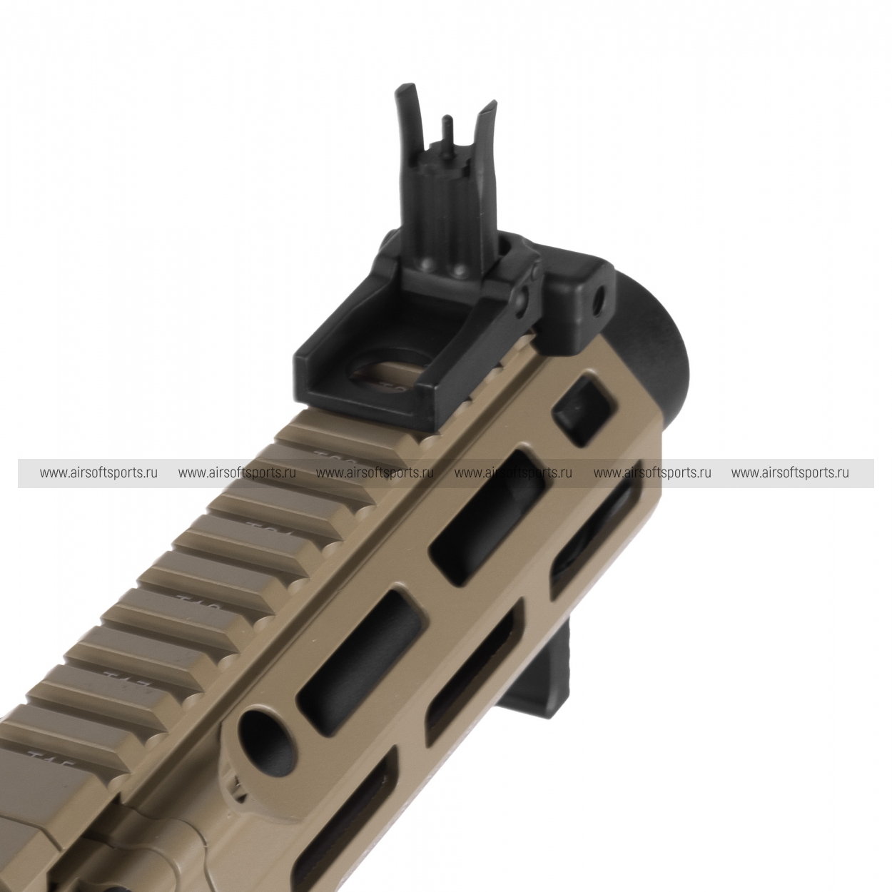 У автомата короткий 6-дюймовый ствол с резьбой для монтажа глушителей или пламегасителей. Легкое цевье с современной системой крепления M-LOK, которое позволяет удобно размещать тактические аксессуары. На всей верхней части корпуса и цевья расположена единая планка Пикатинни, на которой штатно установлены складные откидные прицельные приспособления — мушка и целик.