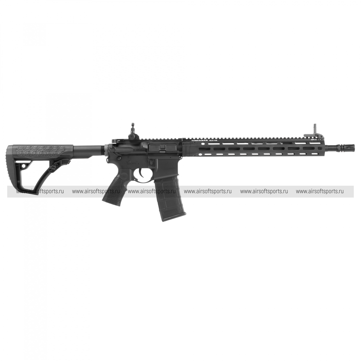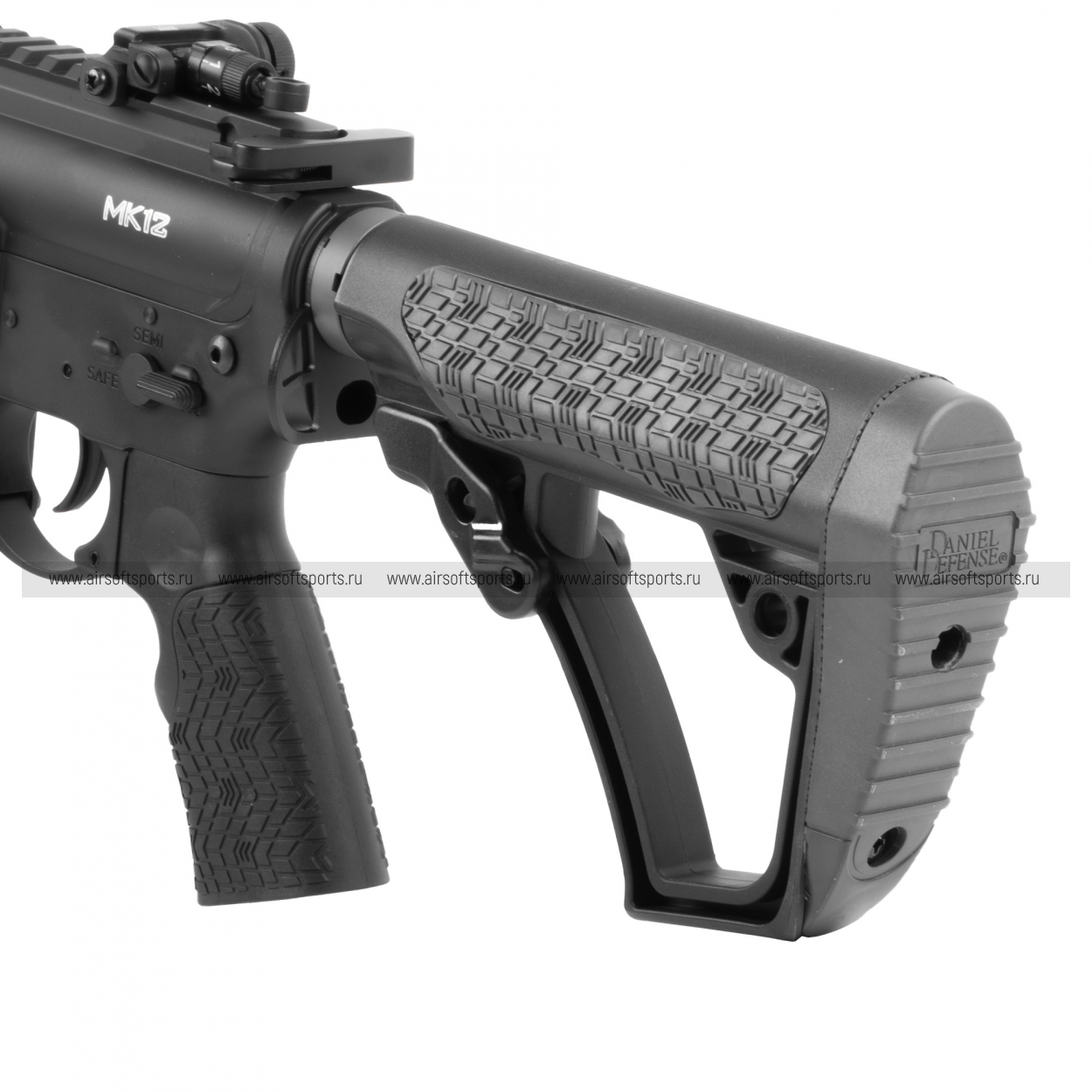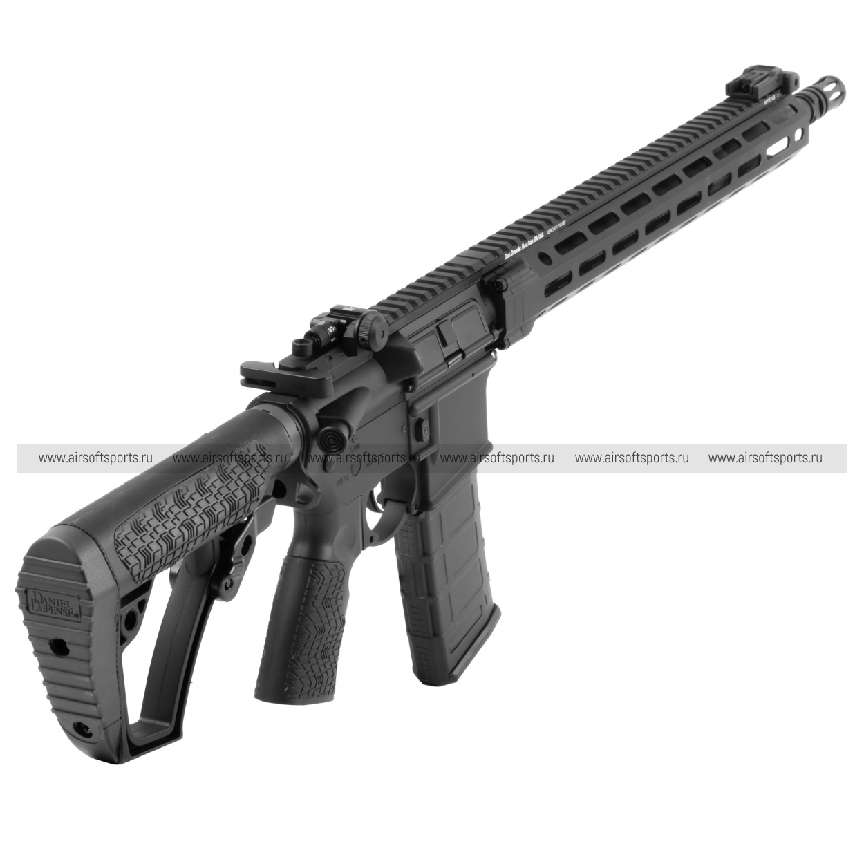 Автомат выполнен с максимальным вниманием к деталям. Верхний и нижний ресиверы изготовлены из прочного алюминиевого сплава, что придает оружию ощутимый вес и прочность, соответствующую боевому аналогу. Матовое черное анодированное покрытие не только придает винтовке стильный и тактический вид, но и обеспечивает дополнительную защиту от царапин и коррозии. Особое внимание уделено лицензионным маркировкам Daniel Defense, которые в точности воспроизведены на корпусе, делая реплику практически неотличимой от оригинала. Качество отделки находится на премиальном уровне, с реалистичной текстурой, приятной на ощупь.