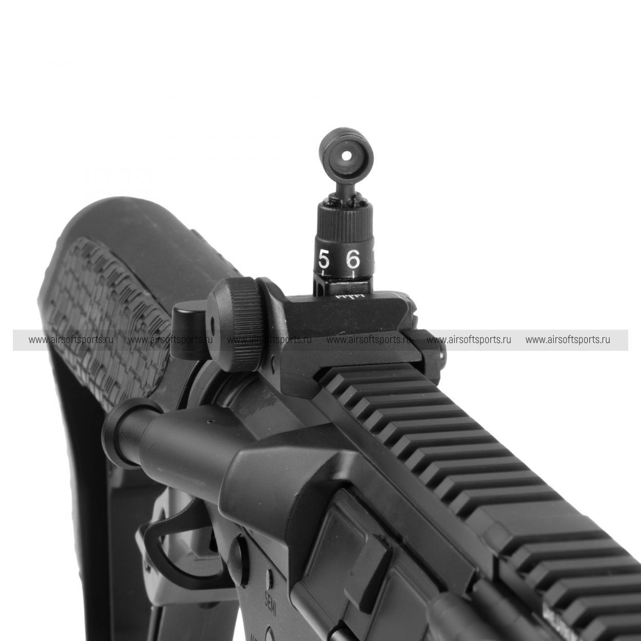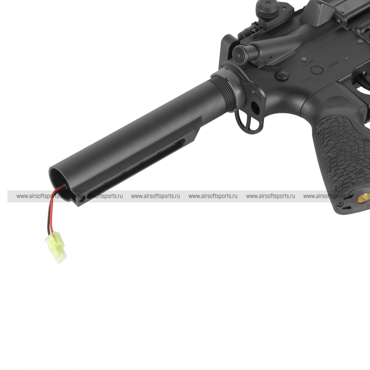 Отсек для аккумулятора находится в прикладе. Внутри приклада достаточно свободного места для установки стандартных аккумуляторов CQB или AK типа с разъемом mini-tamiya. Привод без каких-либо доработок способен питаться от аккумуляторов напряжением как 7.4В, так и 11.1. Одного заряда аккумулятора хватает на несколько часов работы.