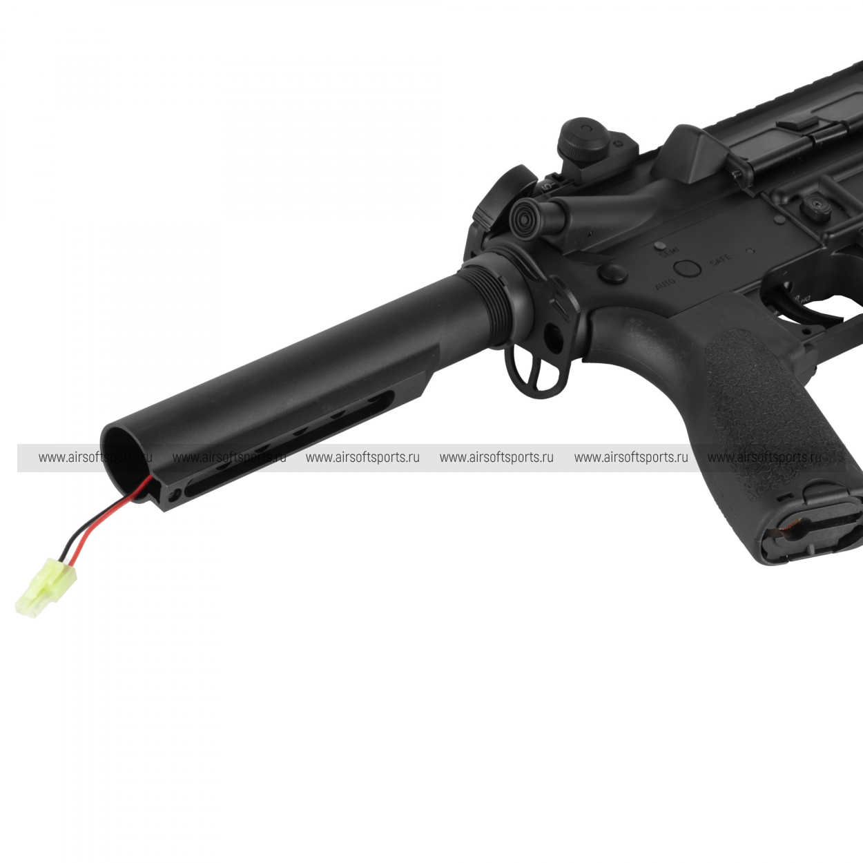 Отсек для аккумулятора находится в прикладе. Внутри приклада достаточно свободного места для установки стандартных аккумуляторов CQB или AK типа с разъемом mini-tamiya. Привод без каких-либо доработок способен питаться от аккумуляторов напряжением как 7.4В, так и 11.1. Одного заряда аккумулятора хватает на несколько часов работы.
