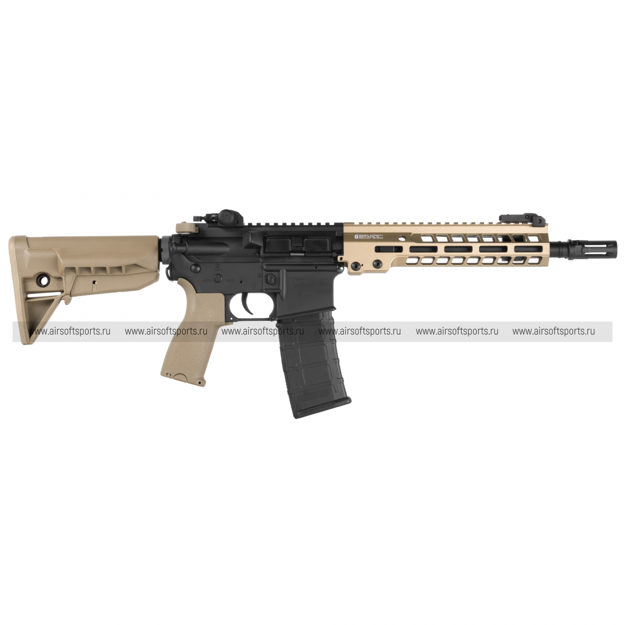 Телескопический приклад автомата выполнен в тактическом стиле, в цвете Тан, с возможностью регулировки по длине. Это позволяет настроить автомат под индивидуальные предпочтения стрелка и обеспечивает комфортное прицеливание, а его светлый оттенок добавляет контраста и стиля.