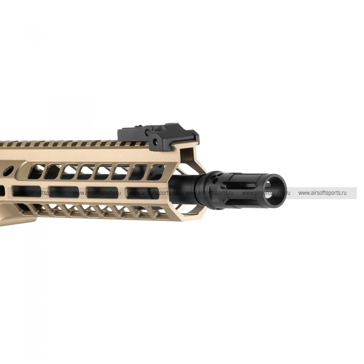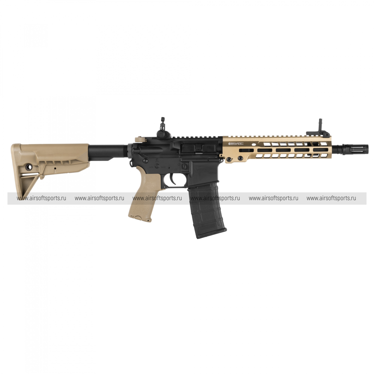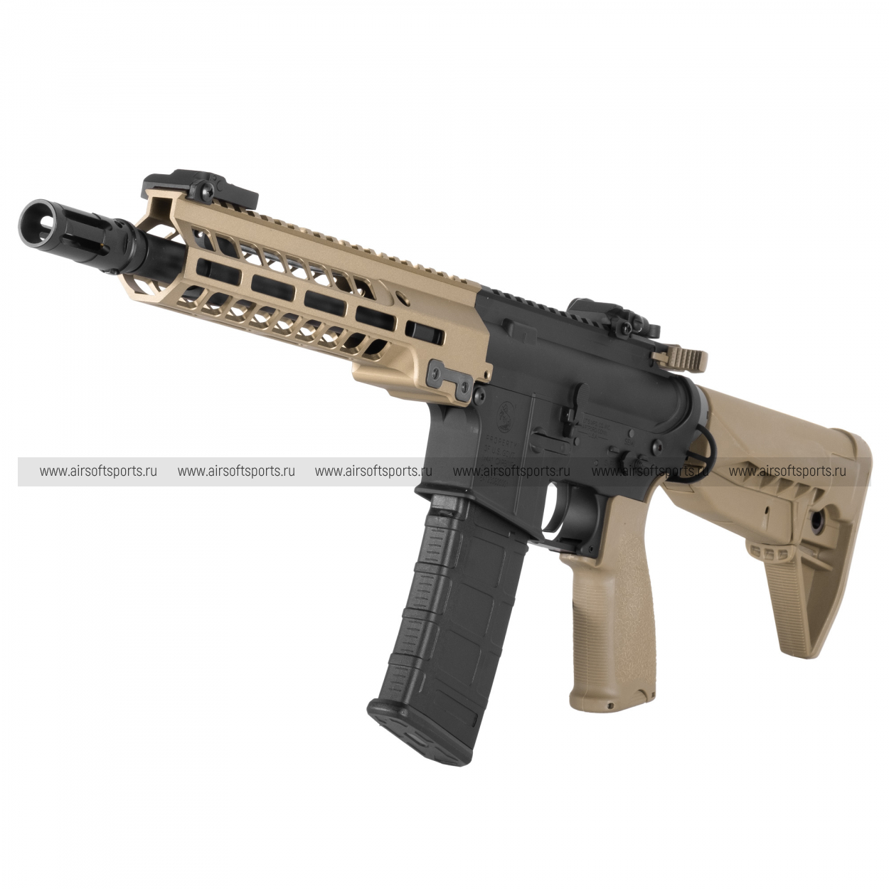 Основной особенностью внешнего вида является 9.5-дюймовое цевье стандарта M-LOK, выполненное в цвете Тан. Это современная система крепления аксессуаров, которая позволяет устанавливать на автомат различные приспособления – тактические фонари, лазерные целеуказатели, рукоятки и многое другое. Интерфейс M-LOK расположен по всей длине цевья, что дает широкие возможности для кастомизации. Само цевье имеет эргономичную форму, удобно лежит в руке и обеспечивает надежный хват, а его песочный оттенок придает автомату уникальный и тактический вид.