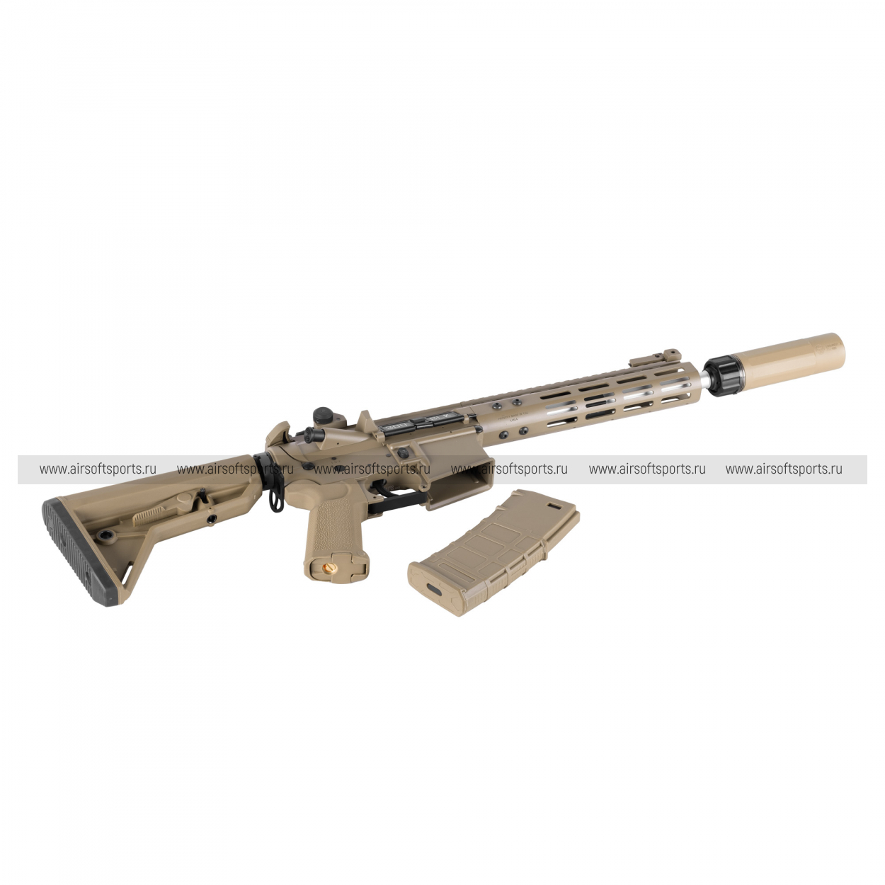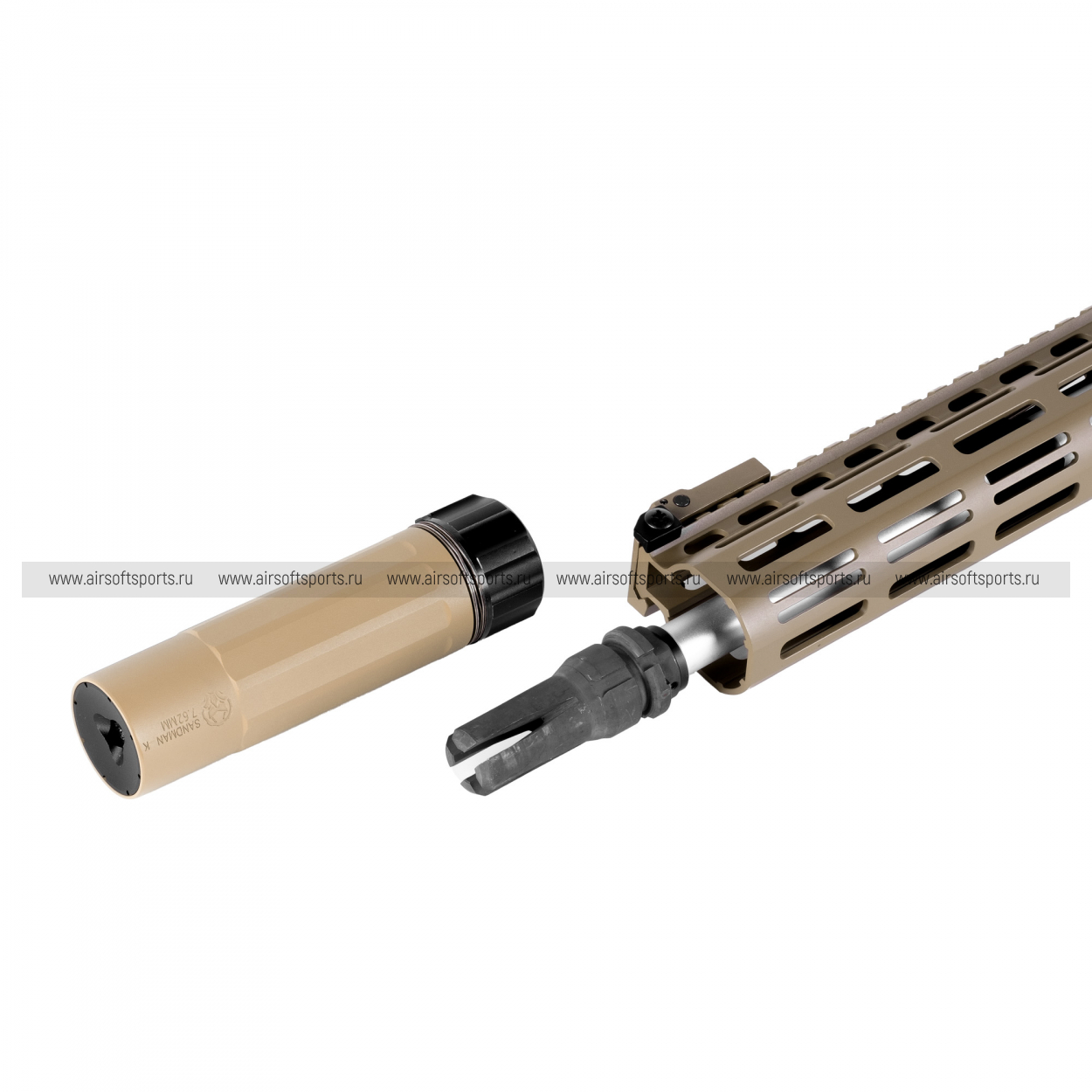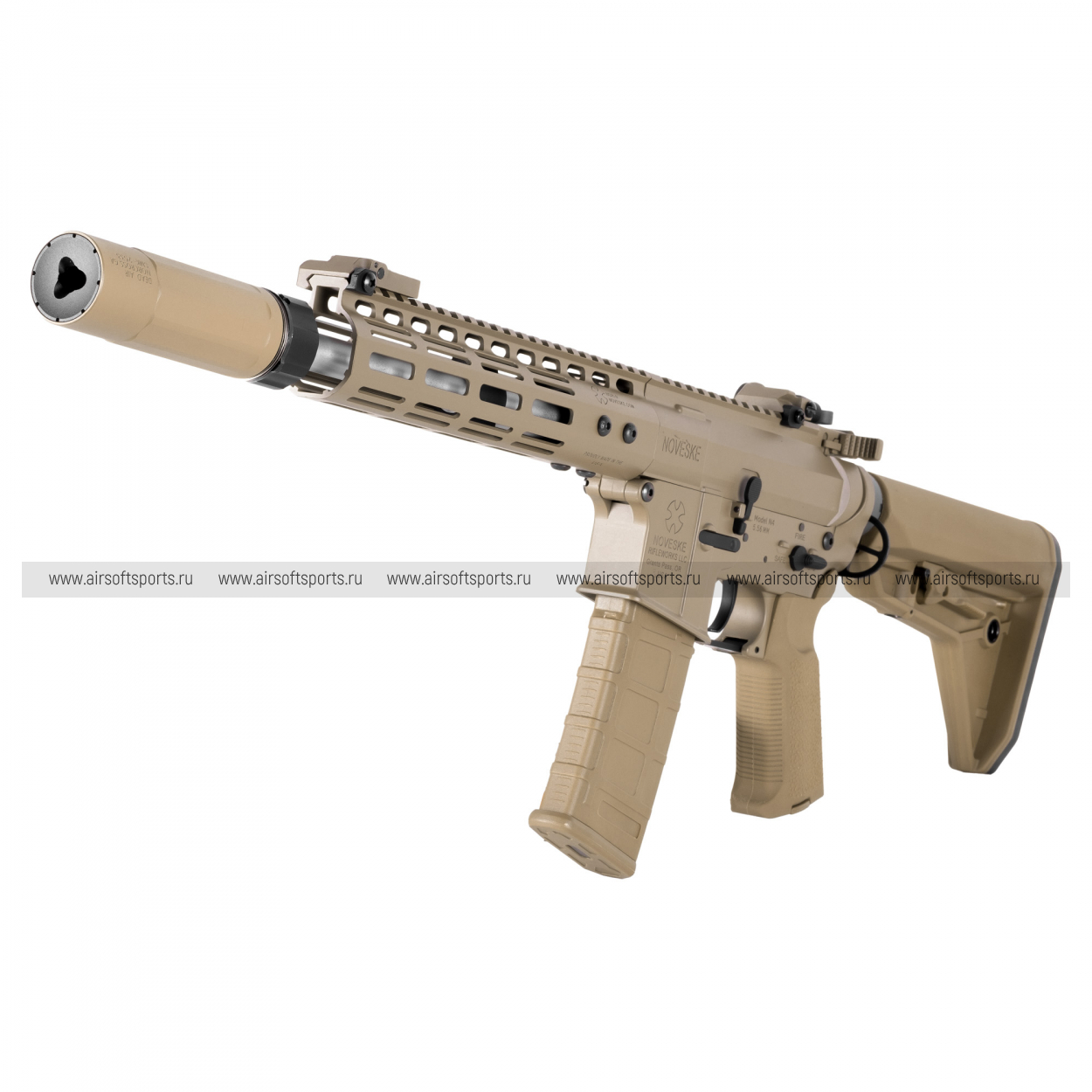 Главное достоинство модели — высочайший уровень реализма. Корпус и облегченное 9.5-дюймовое цевье изготовлены из прочного алюминиевого сплава, что обеспечивает надежность конструкции и приятные тактильные ощущения. Внешний вид дополняет стильная имитация глушителя Dead Air Sandman K, установленная на ствол с стандартной резьбой 14- (отрицательная). Особую аутентичность приводу придают глубокие и четкие маркировки NOVESKE на ресивере и цевье.