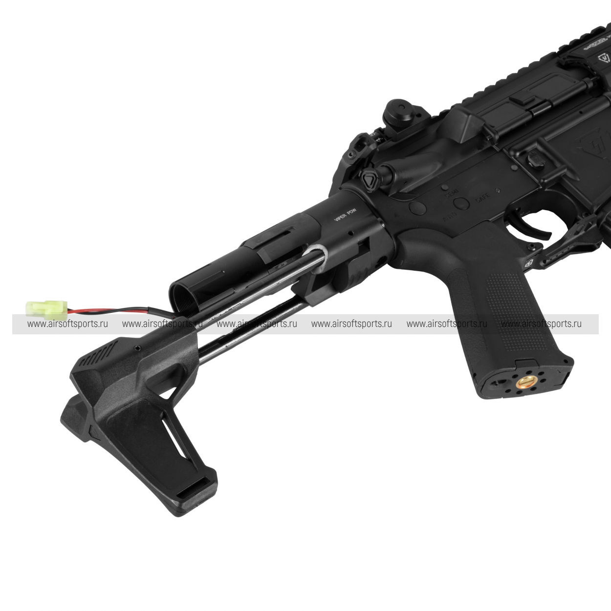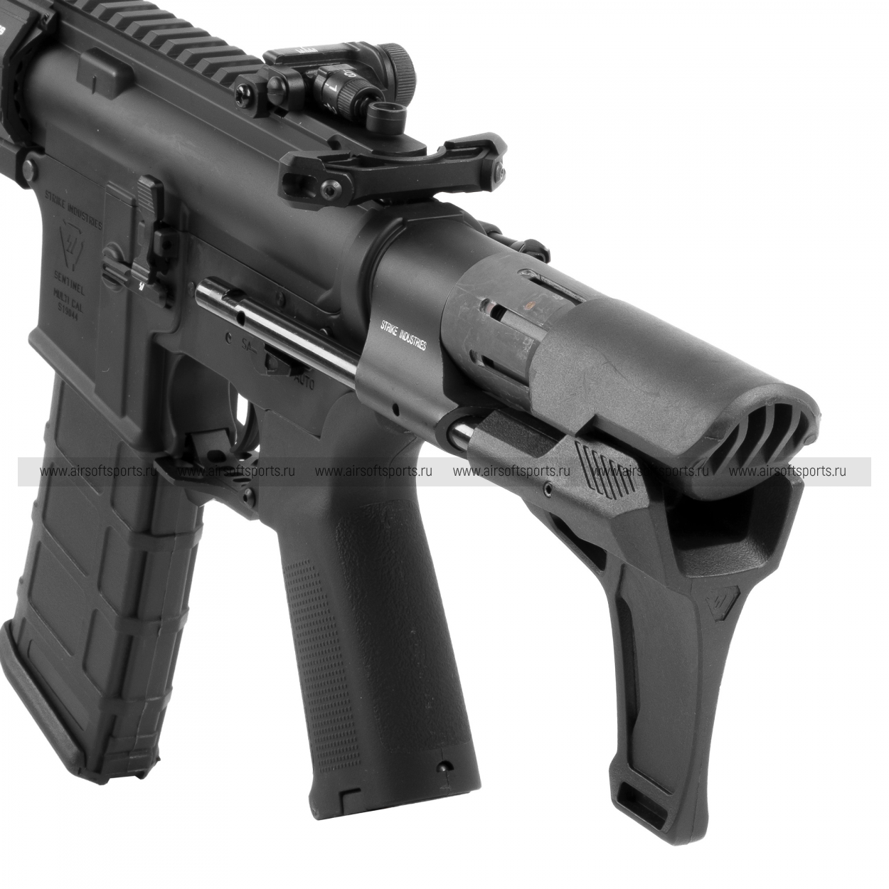 Телескопический приклад автомата выполнен в тактическом стиле, с возможностью регулировки по длине. Это позволяет настроить автомат под индивидуальные предпочтения стрелка и обеспечивает комфортное прицеливание.
