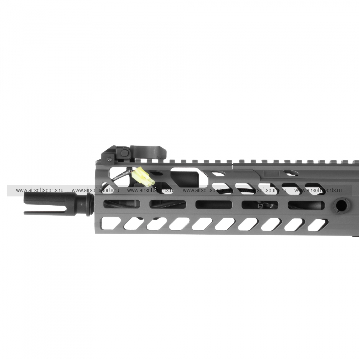 Проводка выведена в цевье. Для удобного использования автомата рекомендуется приобрести имитацию анпека в качестве аккумуляторного отсека, например PEQ-15 от Cyma. Разъем Mini-Tamiya.
