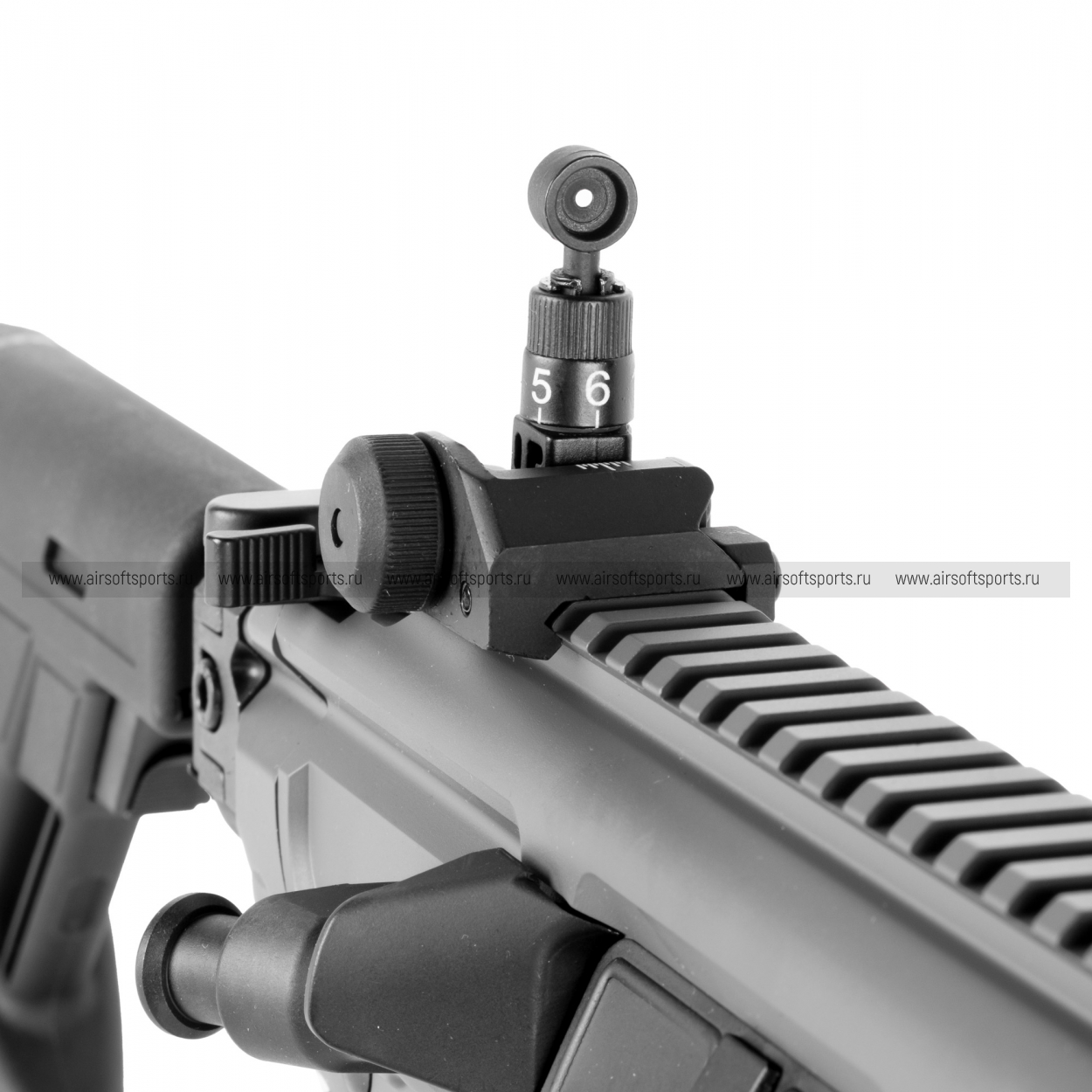 На крышке верхнего ресивера выполнена стандартная планка пикатинни, на которую можно установить практически любой коллиматорный или оптический прицел. Карабин имеет имитацию функции затворной задержки.