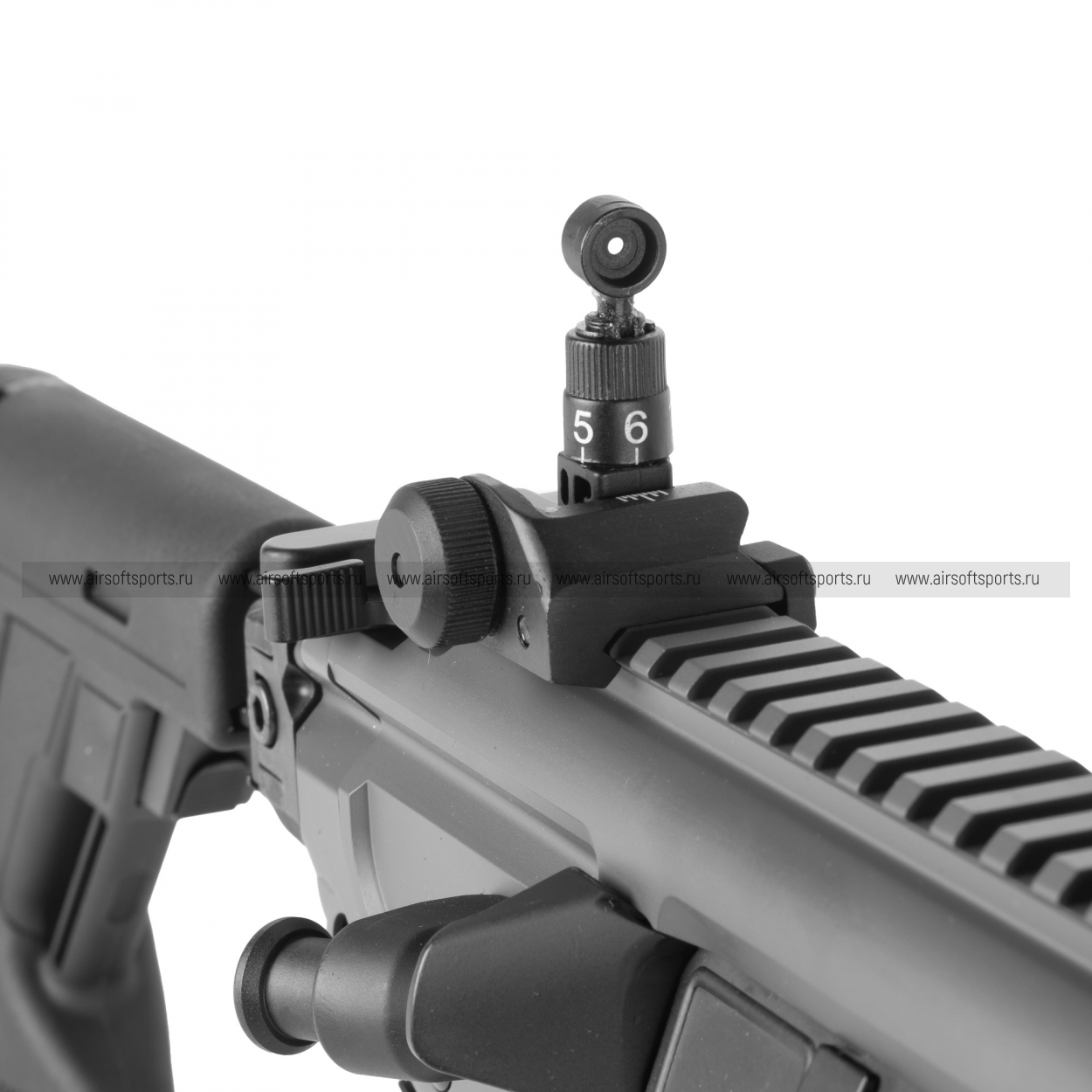 На крышке верхнего ресивера выполнена стандартная планка пикатинни, на которую можно установить практически любой коллиматорный или оптический прицел. Карабин имеет имитацию функции затворной задержки.