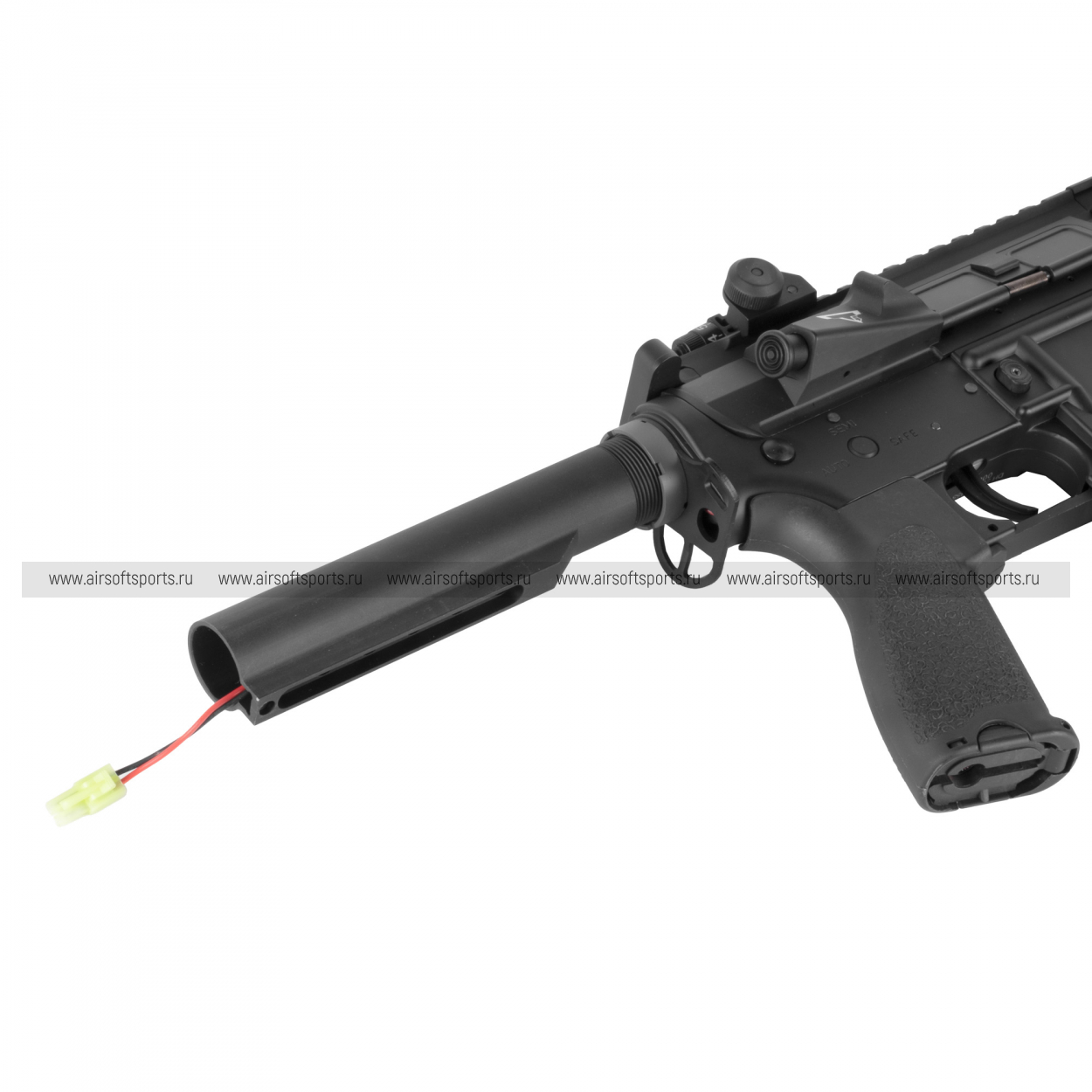 Отсек для аккумулятора находится в прикладе. Внутри приклада достаточно свободного места для установки стандартных аккумуляторов CQB или AK типа с разъемом mini-tamiya. Привод без каких-либо доработок способен питаться от аккумуляторов напряжением как 7.4В, так и 11.1. Одного заряда аккумулятора хватает на несколько часов работы.