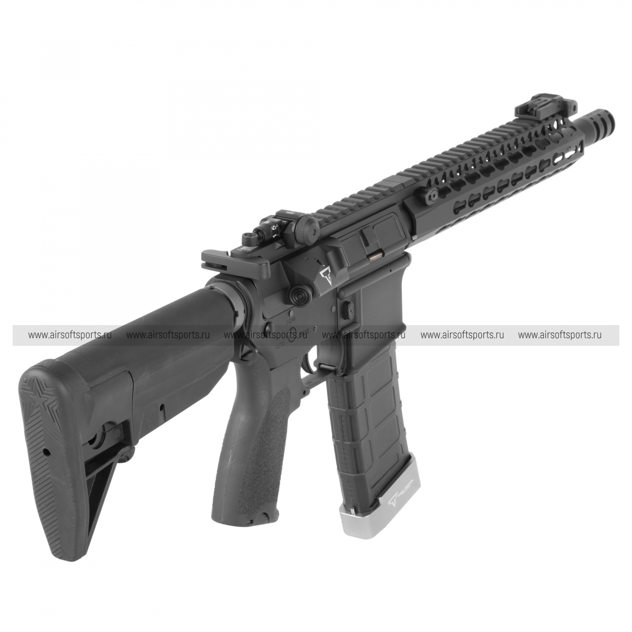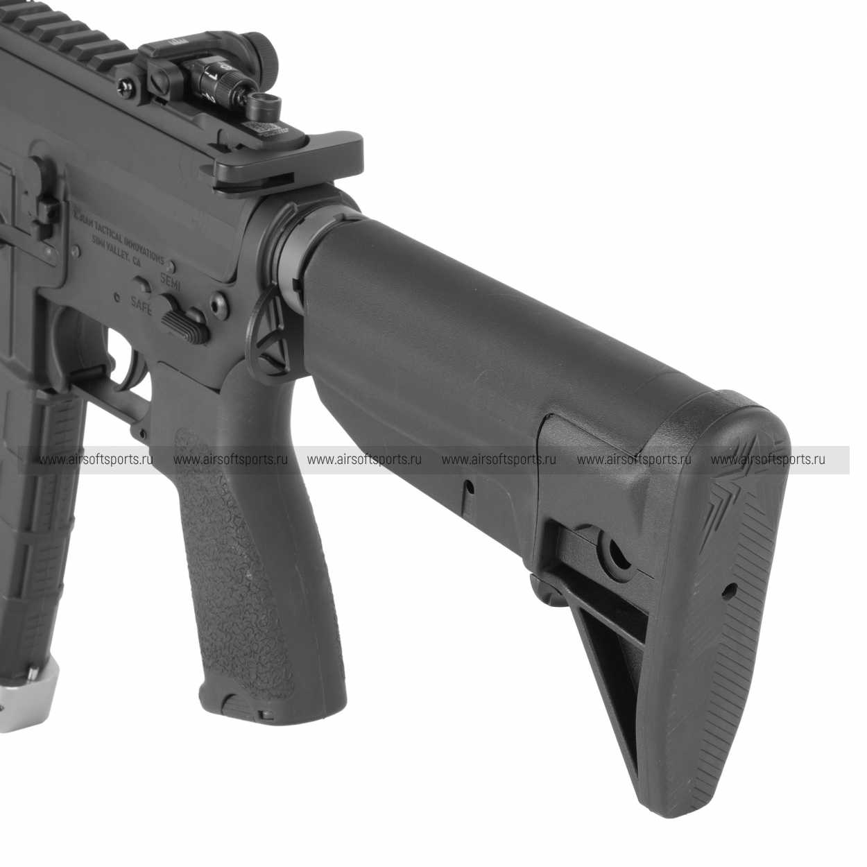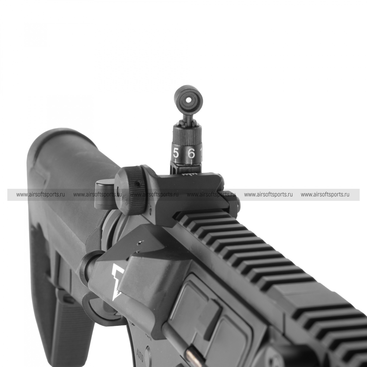Телескопический приклад автомата выполнен в тактическом стиле, с возможностью регулировки по длине. Это позволяет настроить автомат под индивидуальные предпочтения стрелка и обеспечивает комфортное прицеливание.