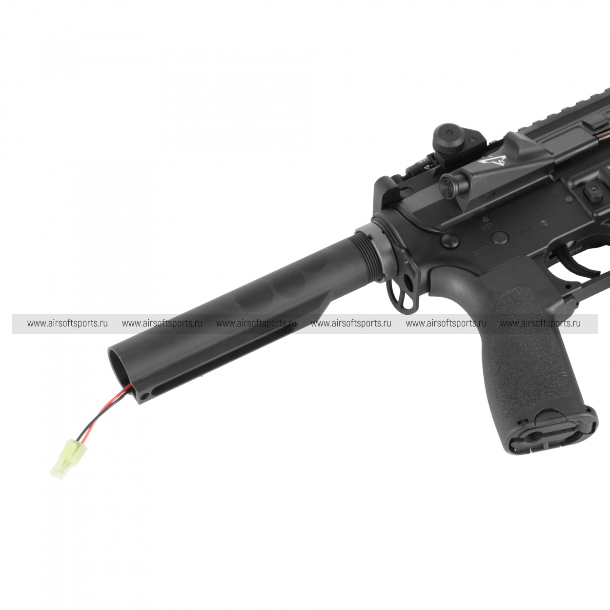 Отсек для аккумулятора находится в прикладе. Внутри приклада достаточно свободного места для установки стандартных аккумуляторов CQB или AK типа с разъемом mini-tamiya. Привод без каких-либо доработок способен питаться от аккумуляторов напряжением как 7.4В, так и 11.1. Одного заряда аккумулятора хватает на несколько часов работы.