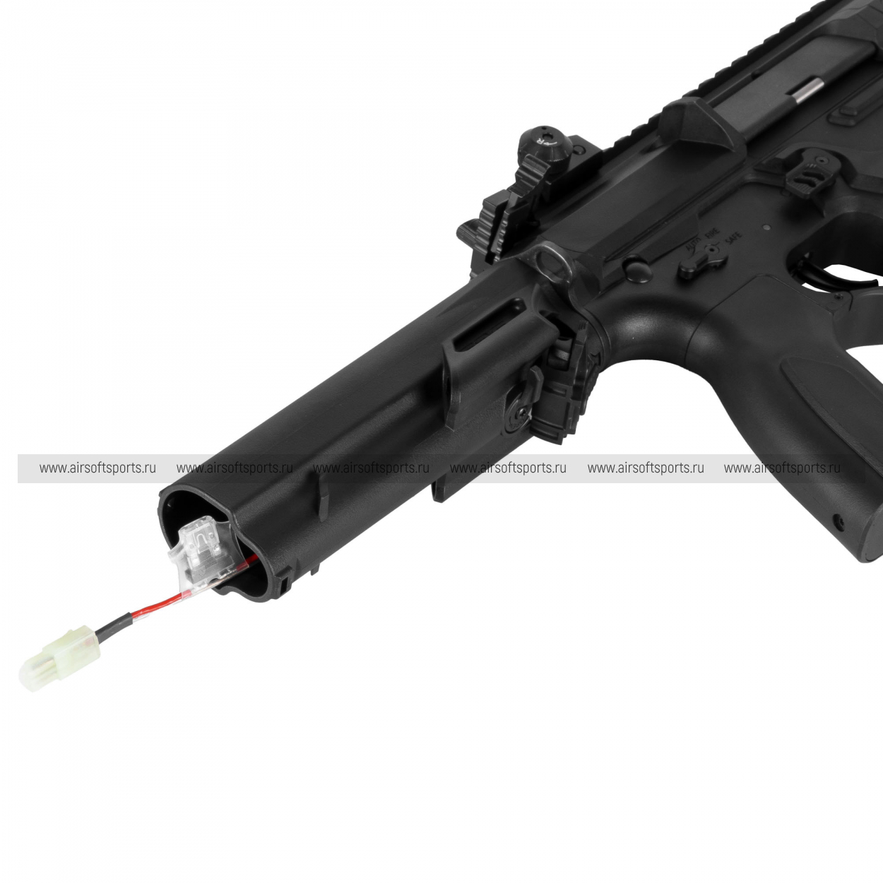 Отсек для аккумулятора находится в телескопическом прикладе. Внутреннее пространство трубы приклада позволяет разместить компактные двух- или трехлепестковые Li-Po аккумуляторы.