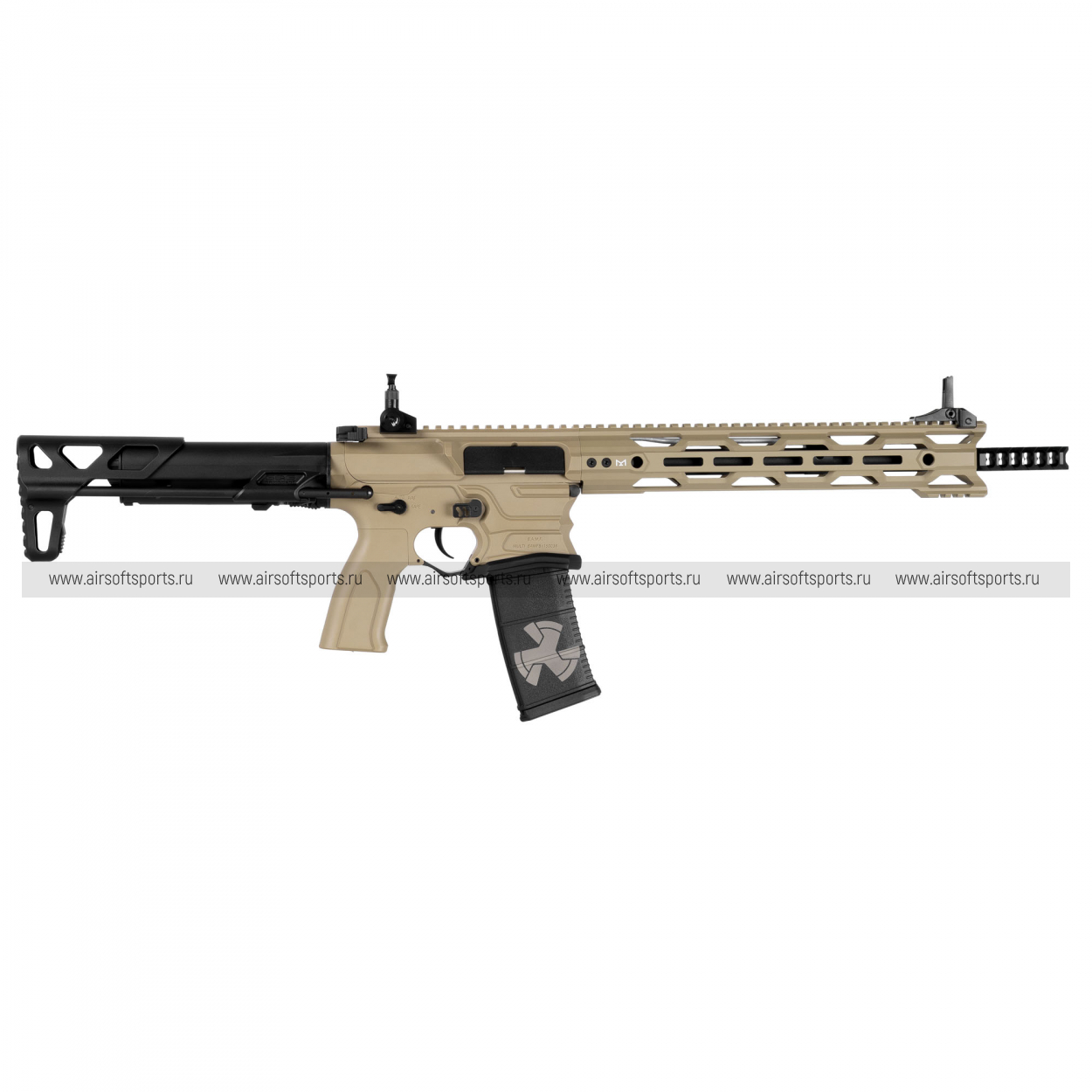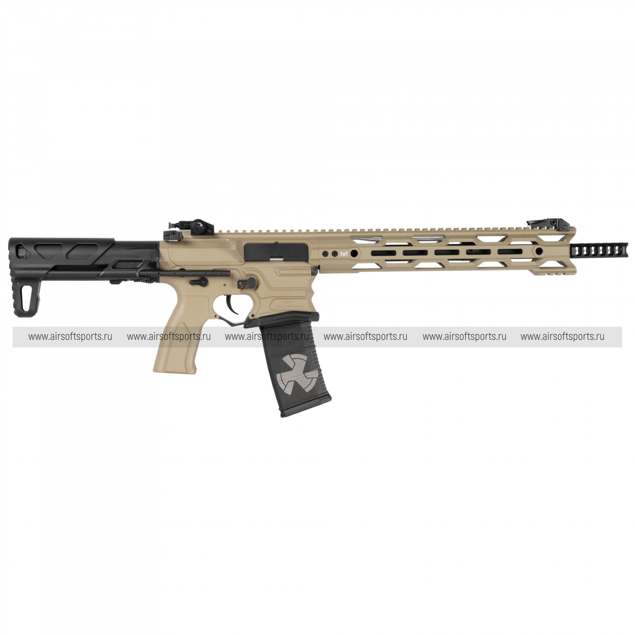BAMF RECON выглядит строго, технологично и очень современно. Длинное облегчённое цевьё с крупными прорезями формирует быстрый и вытянутый силуэт. Верхняя планка по всей длине корпуса делает профиль цельным и функциональным, а складные прицельные приспособления аккуратно дополняют общий образ. Отдельно выделяются спортивный скелетный приклад, необычный дизайн нижней части ресивера и фирменный магазин с заметной графикой — эти детали делают внешний вид автомата более выразительным и запоминающимся. В целом модель смотрится легко, современно и очень эффектно.