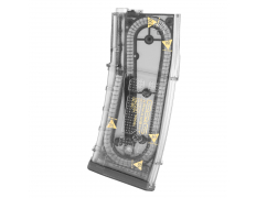 CM16 COMPACT 556 выглядит очень современно, легко и агрессивно. Полностью черное исполнение подчеркивает его тактический характер, а сочетание компактного корпуса с удлинённым облегчённым цевьём делает силуэт особенно выразительным. Верхняя планка по всей длине корпуса и цевья визуально объединяет конструкцию, складные прицельные приспособления аккуратно дополняют профиль, а укороченный скелетный приклад придает модели спортивный и необычный вид. Отдельно выделяется полупрозрачный магазин с имитацией патронов — эффектная деталь, которая делает внешний облик более интересным и запоминающимся.