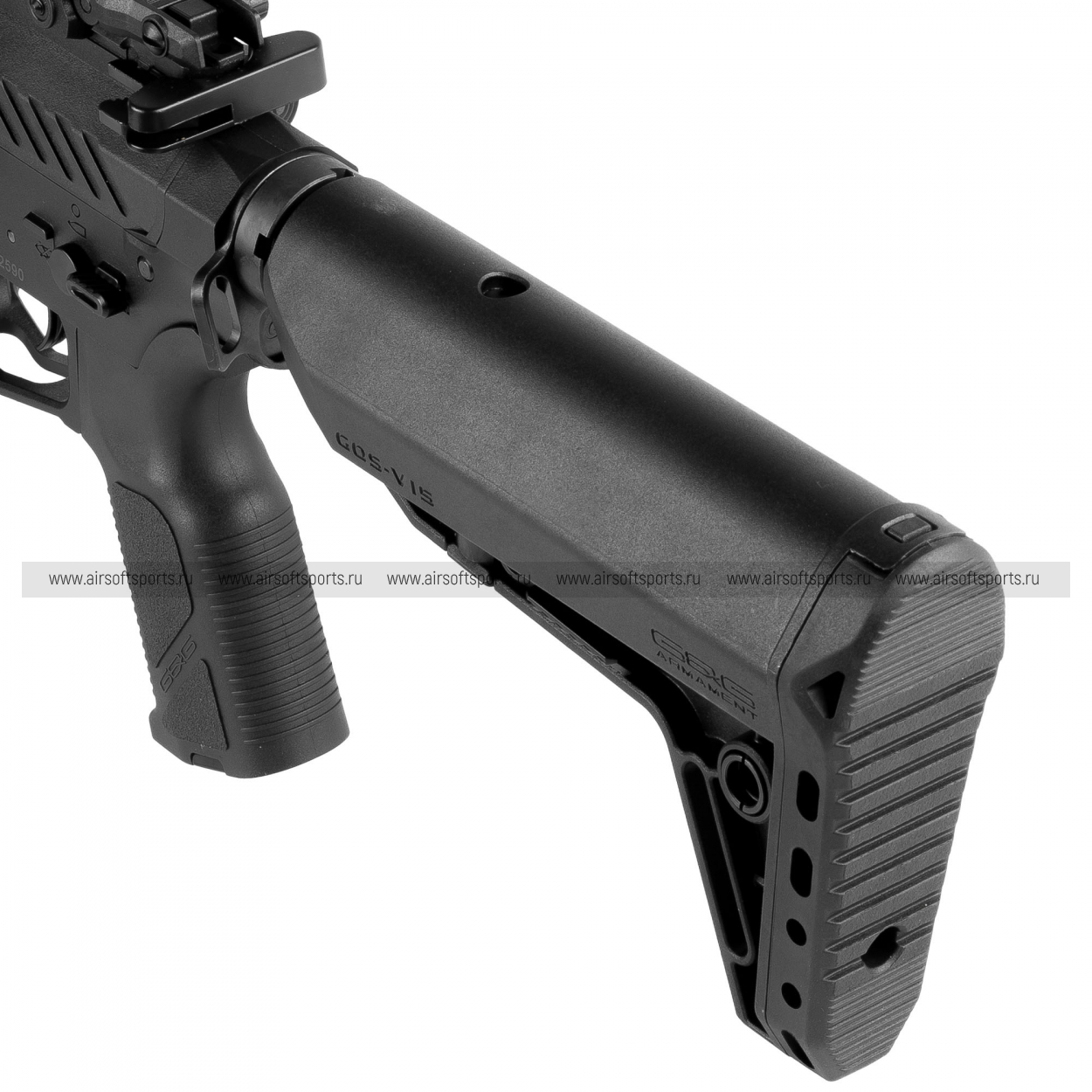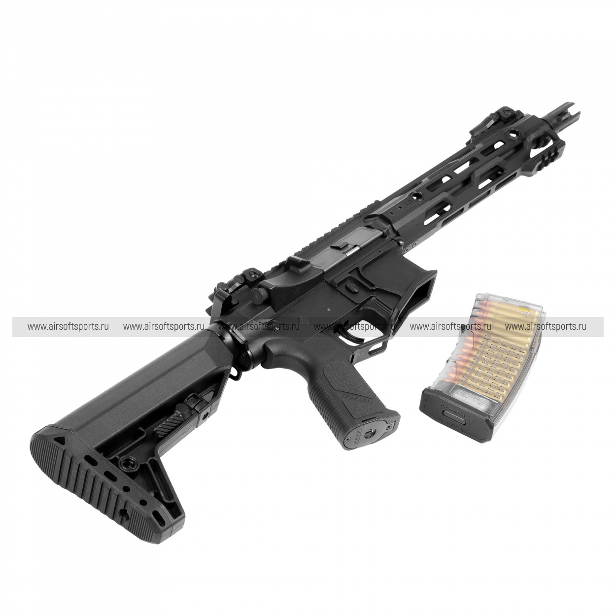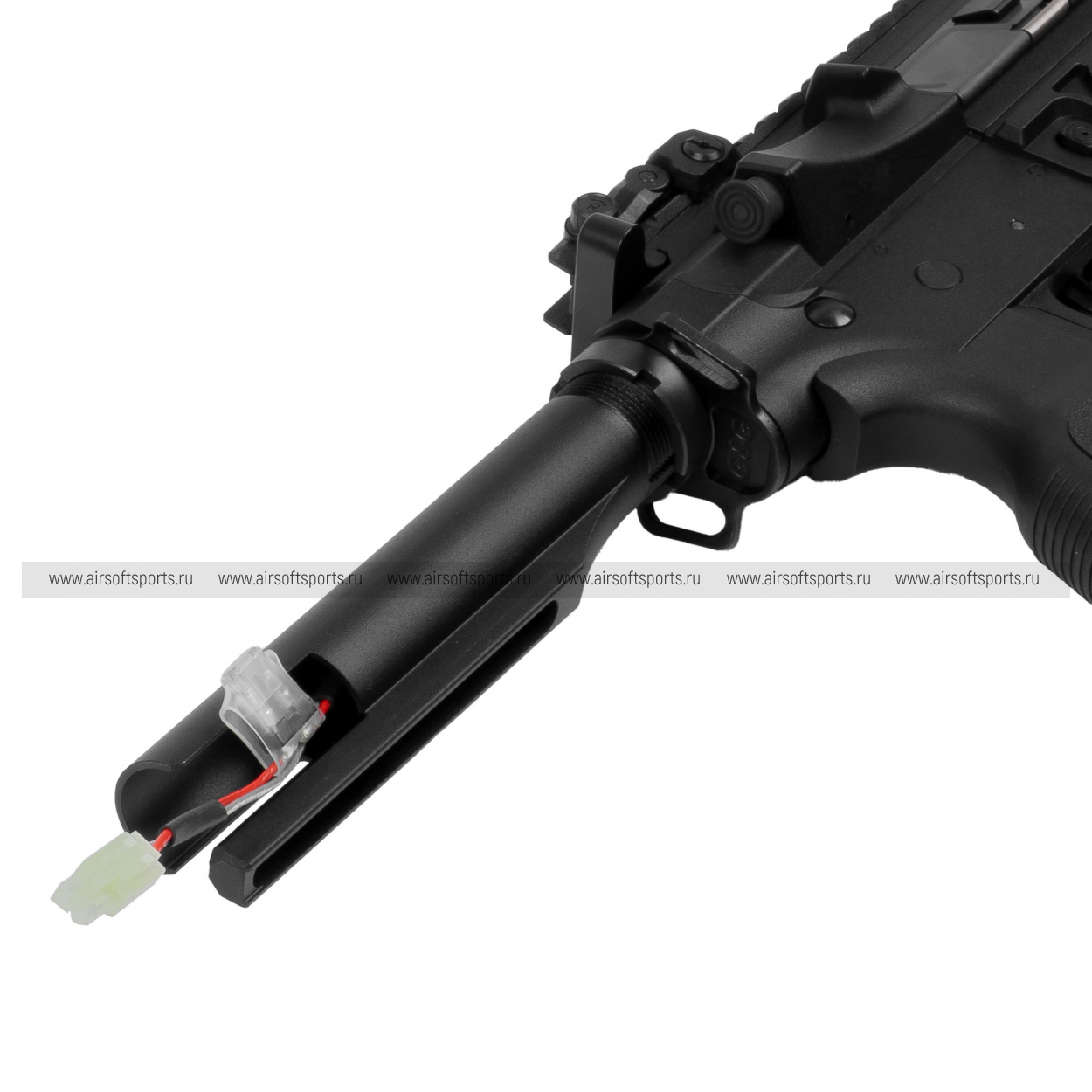 Отсек для аккумулятора находится в выдвижном прикладе. Конструкция приклада имеет расширенное пространство, позволяющее разместить компактные Li-Po аккумуляторы напряжением 11.1В, которые рекомендуются для стабильной работы электронной платы.