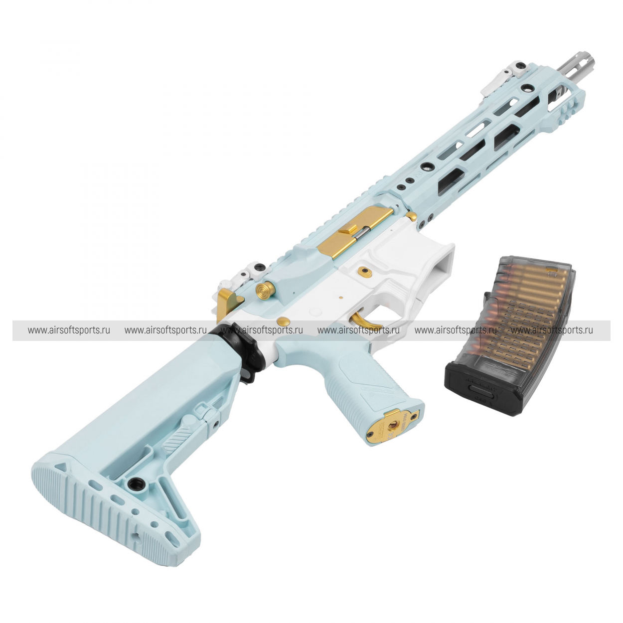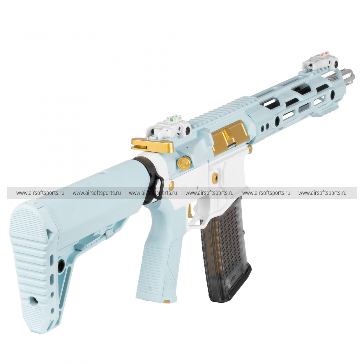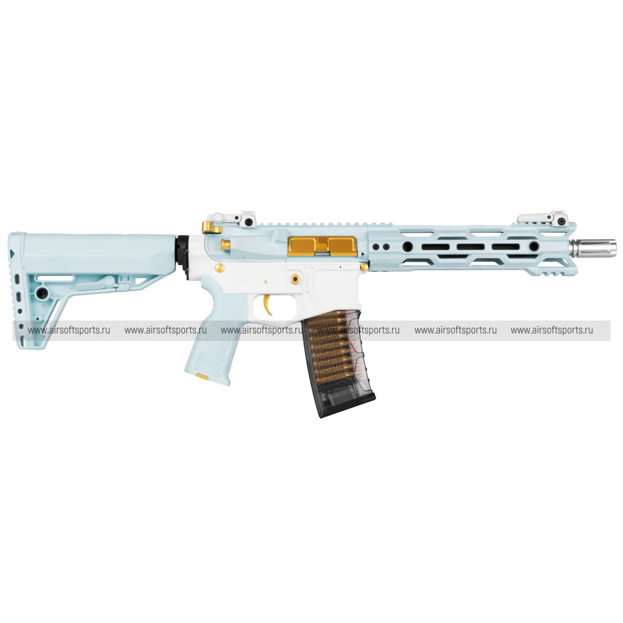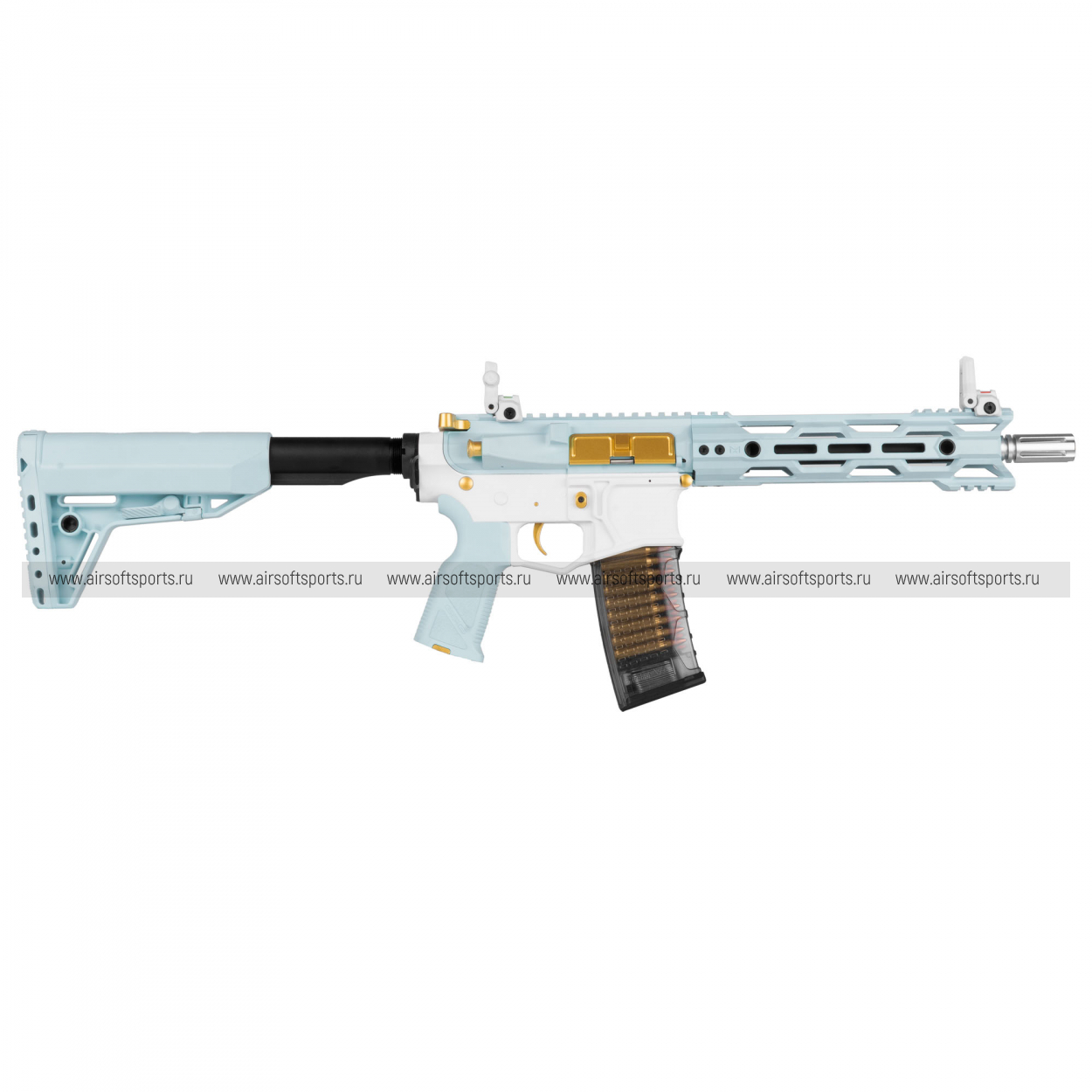CM16 STEALTH 556 Macaron Blue выглядит очень необычно, свежо и эффектно. Основные элементы выполнены в нежном голубом оттенке, который контрастирует с белым ресивером и черными деталями, а золотистые акценты на органах управления и декоративных элементах делают образ особенно выразительным. Облегчённое цевьё с геометричными прорезями сохраняет современный тактический силуэт, верхняя планка по всей длине корпуса добавляет целостности, а складные прицельные приспособления аккуратно завершают общий профиль. Полупрозрачный магазин хорошо вписывается в общий стиль и делает внешний вид еще более оригинальным и запоминающимся.