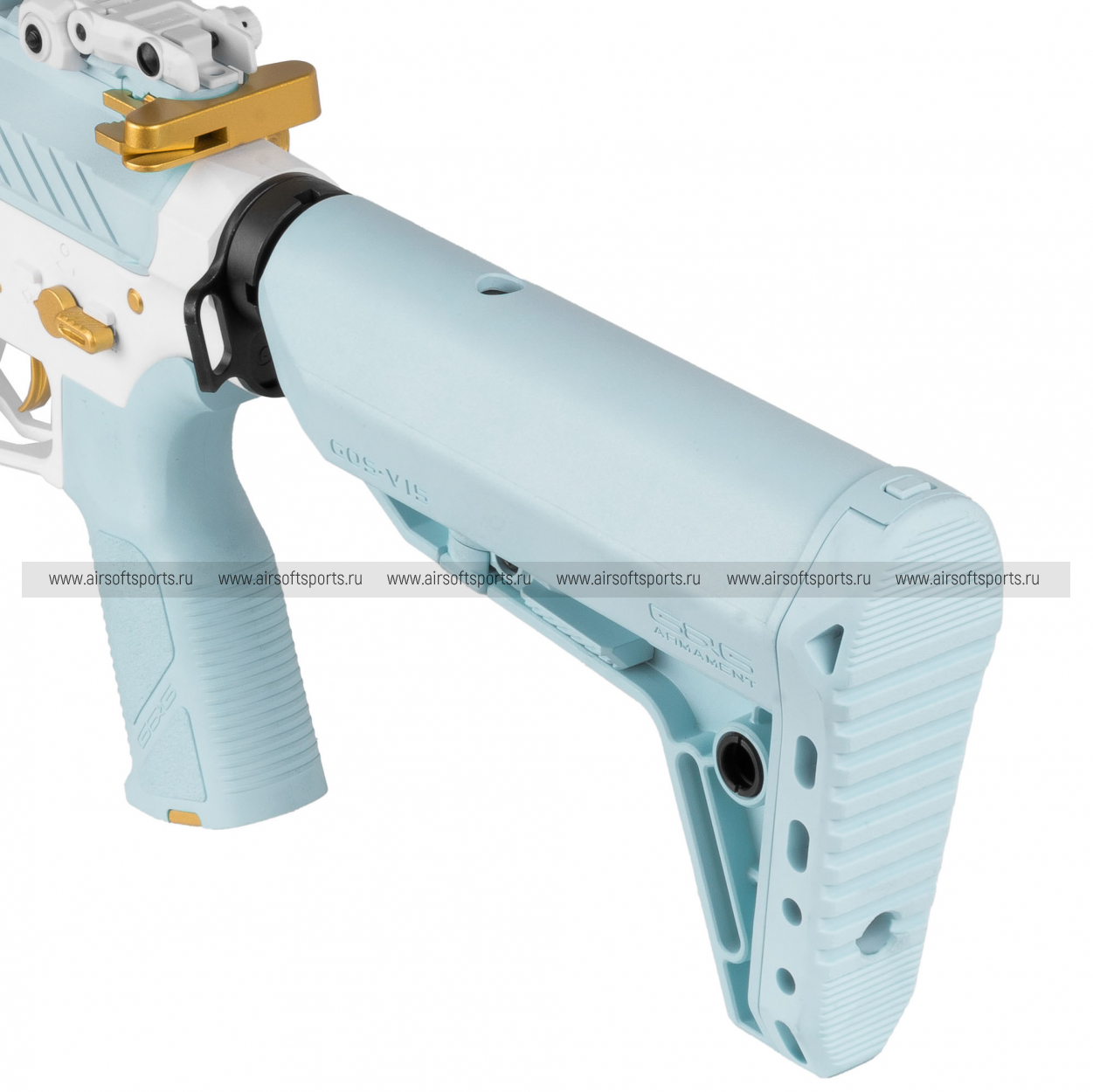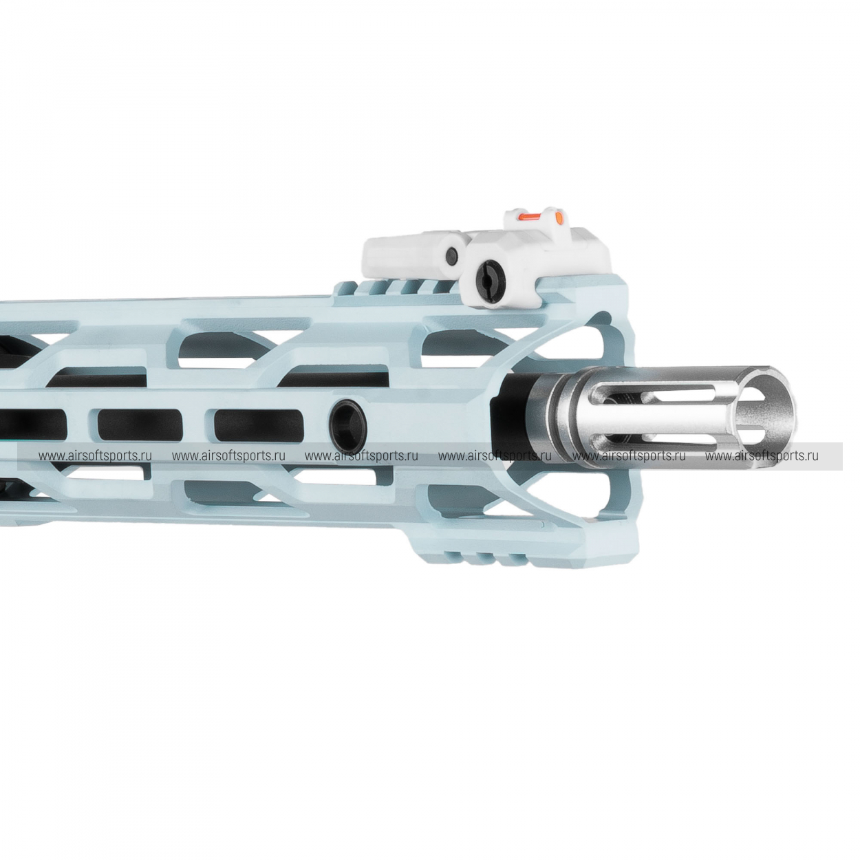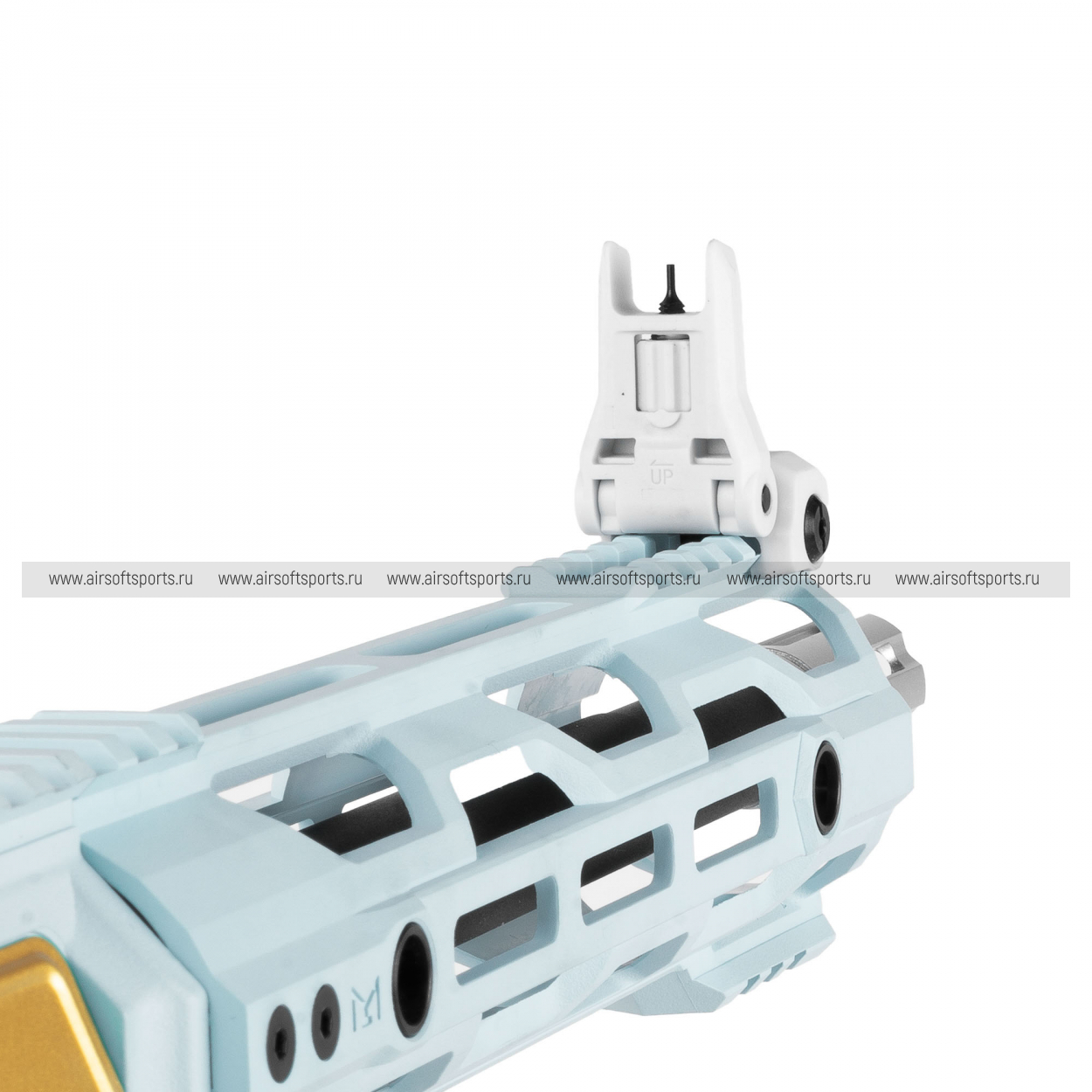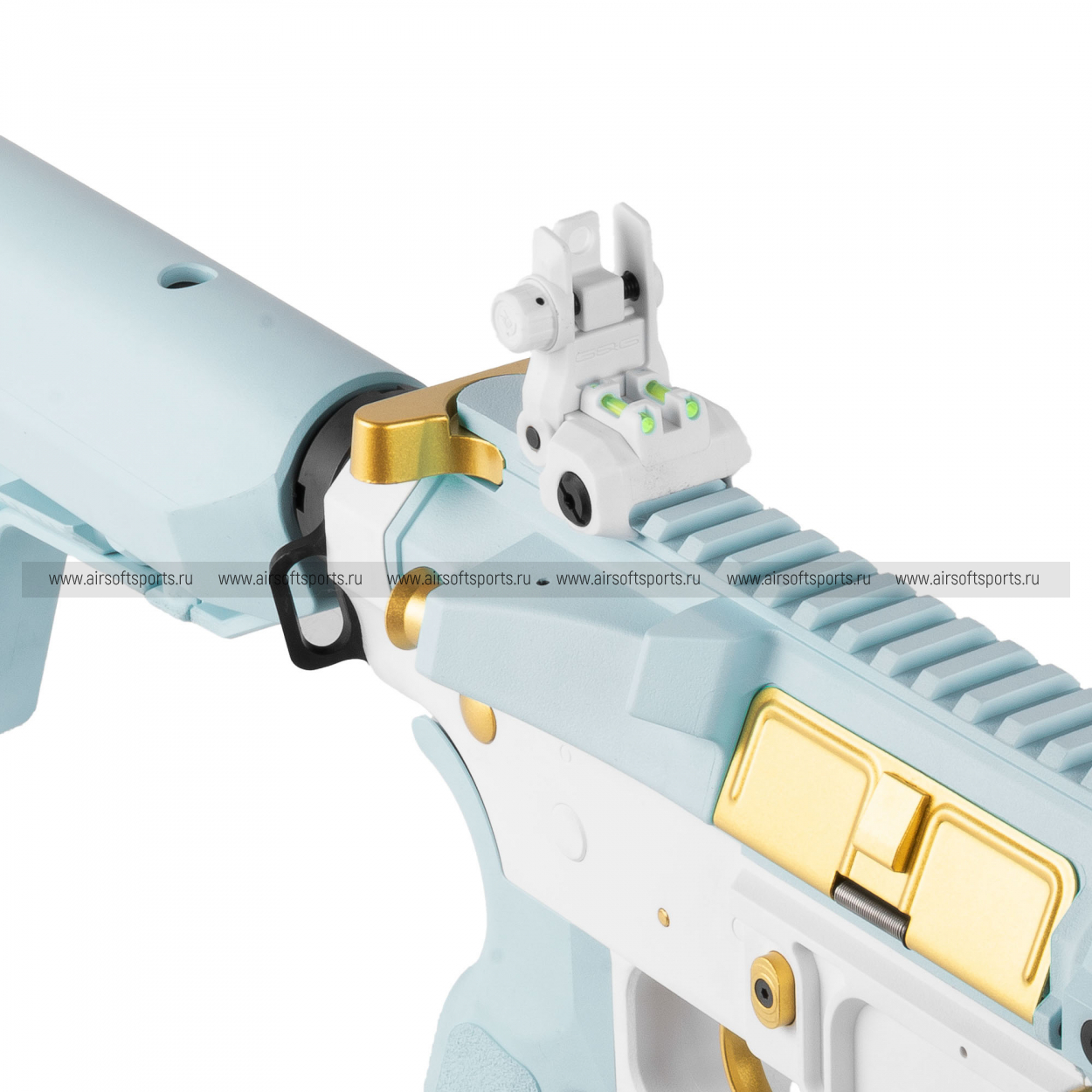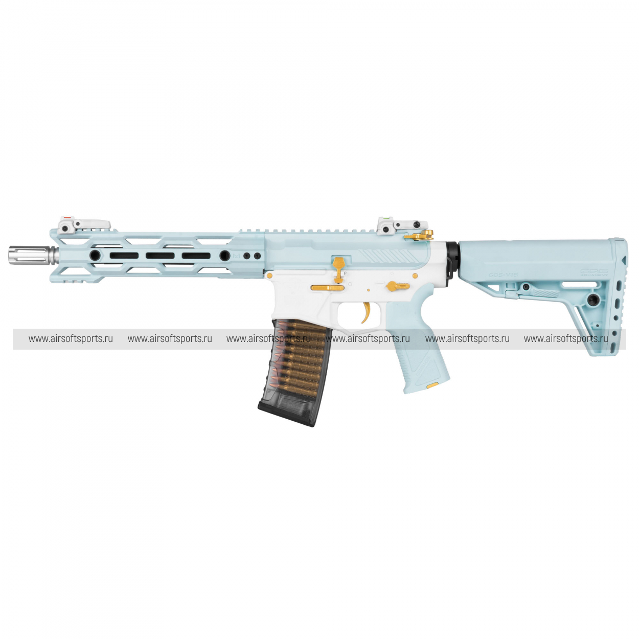 CM16 STEALTH 556 Macaron Blue выглядит очень необычно, свежо и эффектно. Основные элементы выполнены в нежном голубом оттенке, который контрастирует с белым ресивером и черными деталями, а золотистые акценты на органах управления и декоративных элементах делают образ особенно выразительным. Облегчённое цевьё с геометричными прорезями сохраняет современный тактический силуэт, верхняя планка по всей длине корпуса добавляет целостности, а складные прицельные приспособления аккуратно завершают общий профиль. Полупрозрачный магазин хорошо вписывается в общий стиль и делает внешний вид еще более оригинальным и запоминающимся.