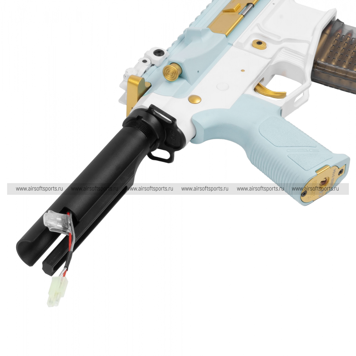 Отсек для аккумулятора находится в выдвижном прикладе. Конструкция приклада имеет расширенное пространство, позволяющее разместить компактные Li-Po аккумуляторы напряжением 11.1В, которые рекомендуются для стабильной работы электронной платы.