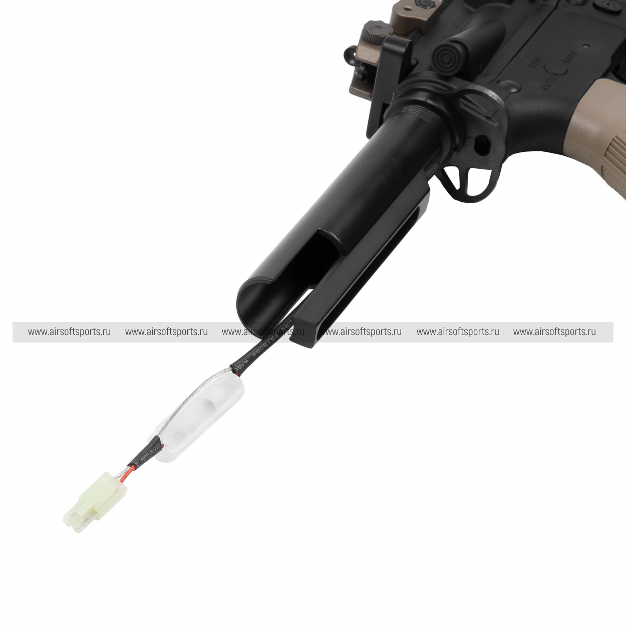 Отсек для аккумулятора находится в выдвижном прикладе. Конструкция приклада имеет расширенное пространство, позволяющее разместить Li-Po аккумуляторы.
