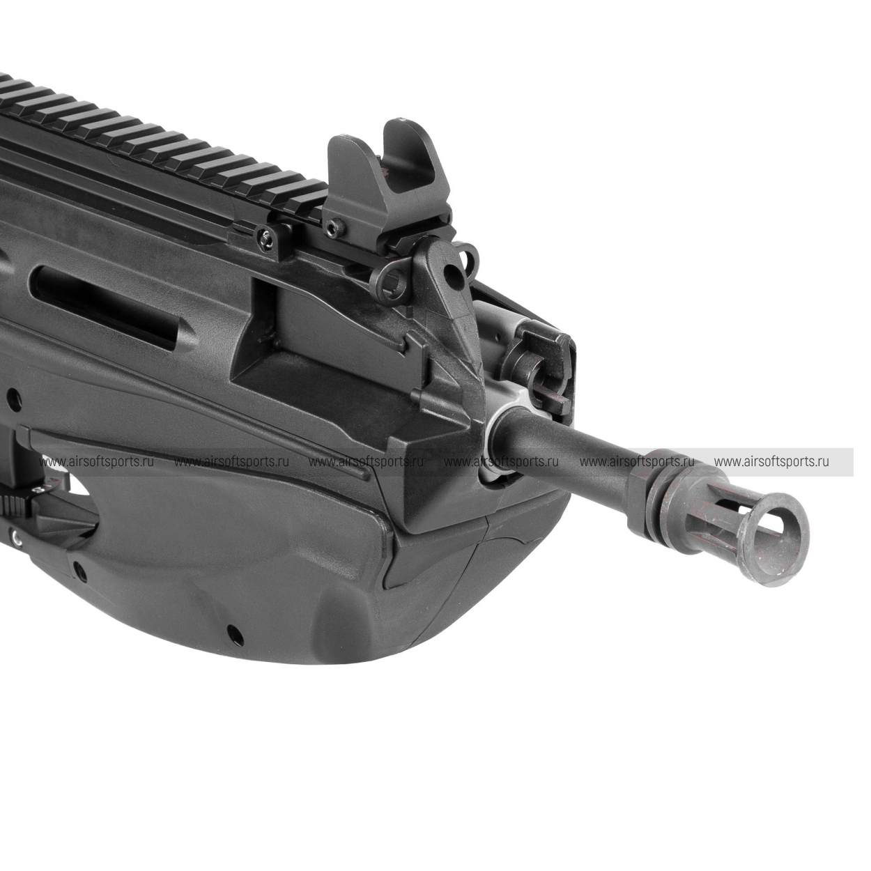 F2000 Tactical выглядит необычно, цельно и очень футуристично. Обтекаемый корпус с плавными линиями сразу выделяет модель на фоне традиционных AR- и AK-образных реплик, а буллпап-компоновка делает силуэт компактным и плотным. Верхняя планка по всей длине корпуса подчеркивает тактический характер модели и визуально вытягивает профиль, а интегрированная форма приклада и основной части корпуса создает ощущение монолитной конструкции. Характерные крупные вырезы в области рукояти и спусковой скобы, закрытая передняя часть и аккуратно встроенные органы управления делают внешний вид современным, эргономичным и очень узнаваемым. В целом модель смотрится оригинально, технологично и заметно отличается от более привычных страйкбольных автоматов.