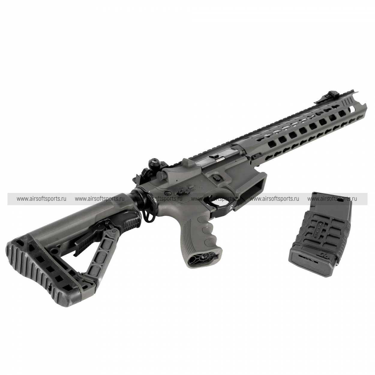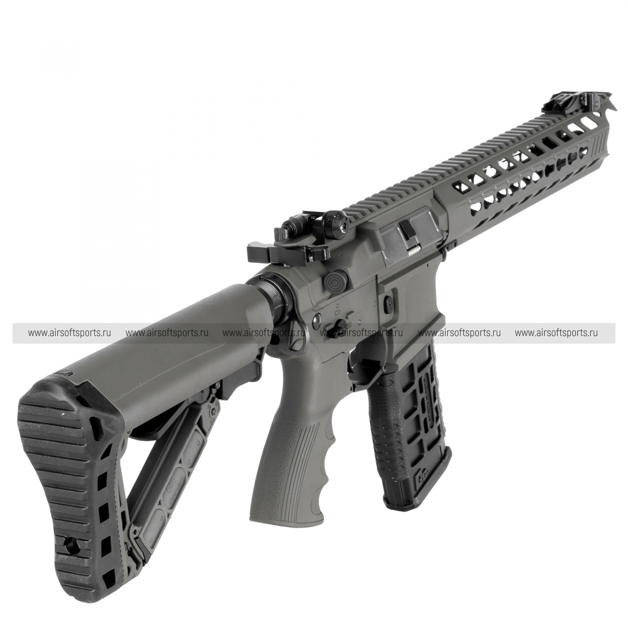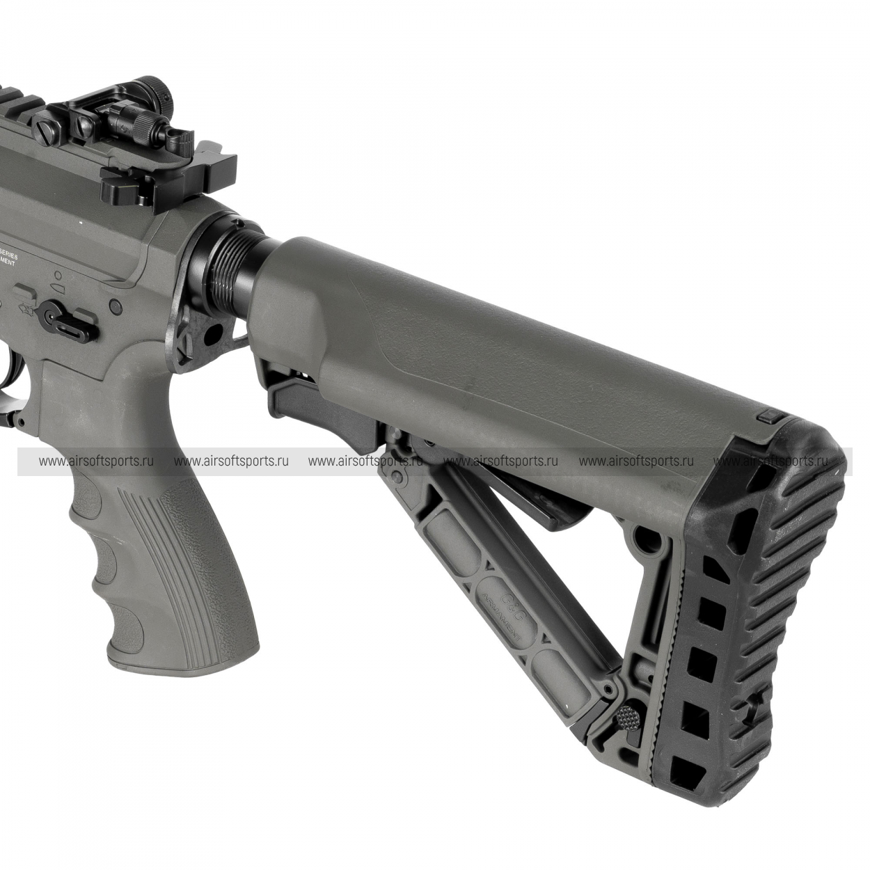 GC16 Predator выглядит современно, агрессивно и очень технологично. Длинное облегчённое цевьё с крупными продолговатыми прорезями делает силуэт вытянутым, легким и динамичным, а верхняя планка по всей длине корпуса визуально объединяет конструкцию в цельный профиль. Складные механические прицельные приспособления аккуратно дополняют общий образ, а характерные формы цевья и его передней части добавляют модели более выразительный и почти кастомный внешний вид. Телескопический приклад с облегчённой конструкцией, эргономичная пистолетная рукоять с рельефом под пальцы и магазин в современном стиле AR-платформы завершают образ. В целом привод смотрится стильно, функционально и заметно выделяется среди более классических вариантов.