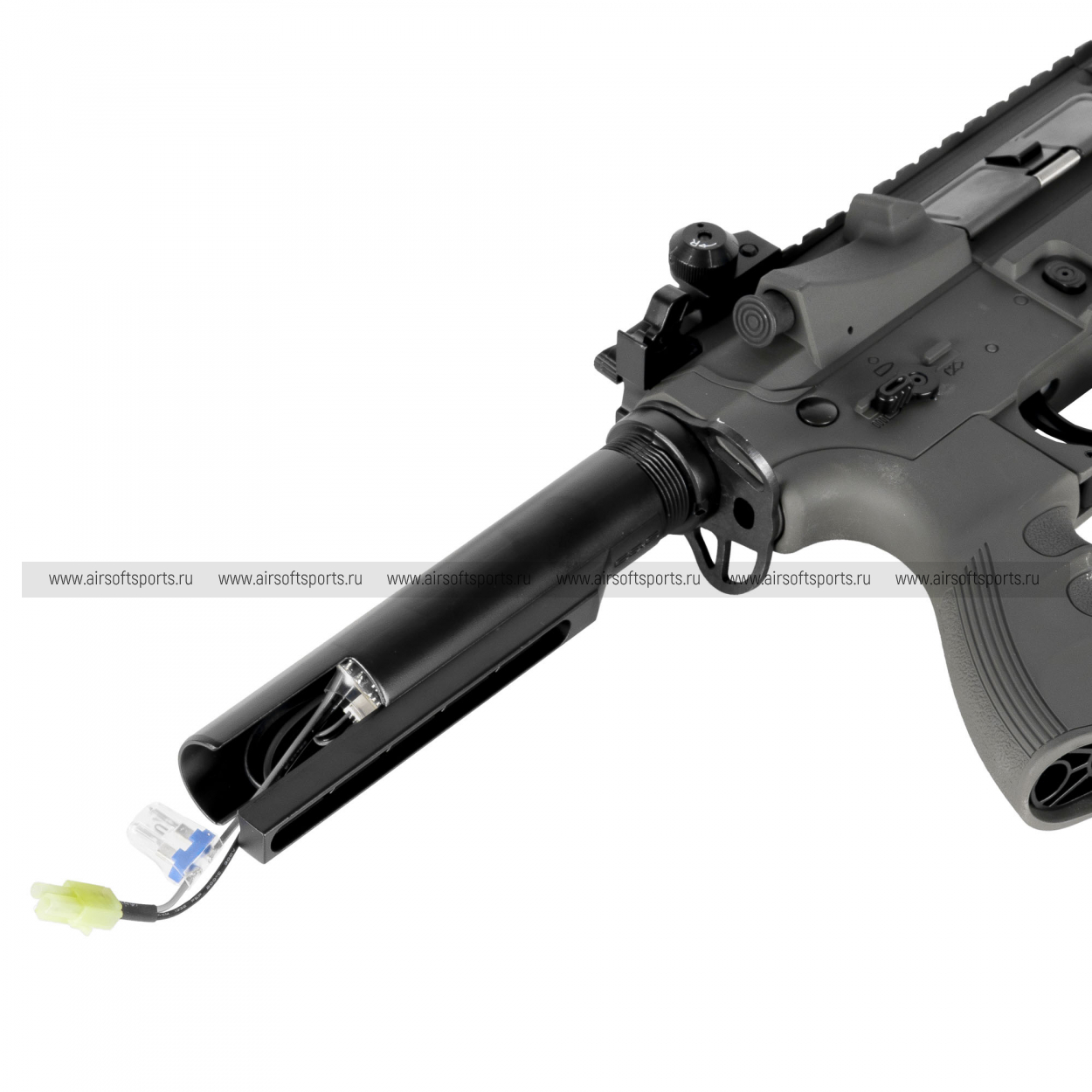 Отсек для аккумулятора находится в телескопическом прикладе. Конструкция приклада специально оптимизирована для удобного размещения двух- или трехлепестковых Li-Po аккумуляторов.