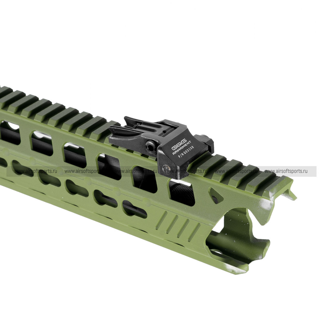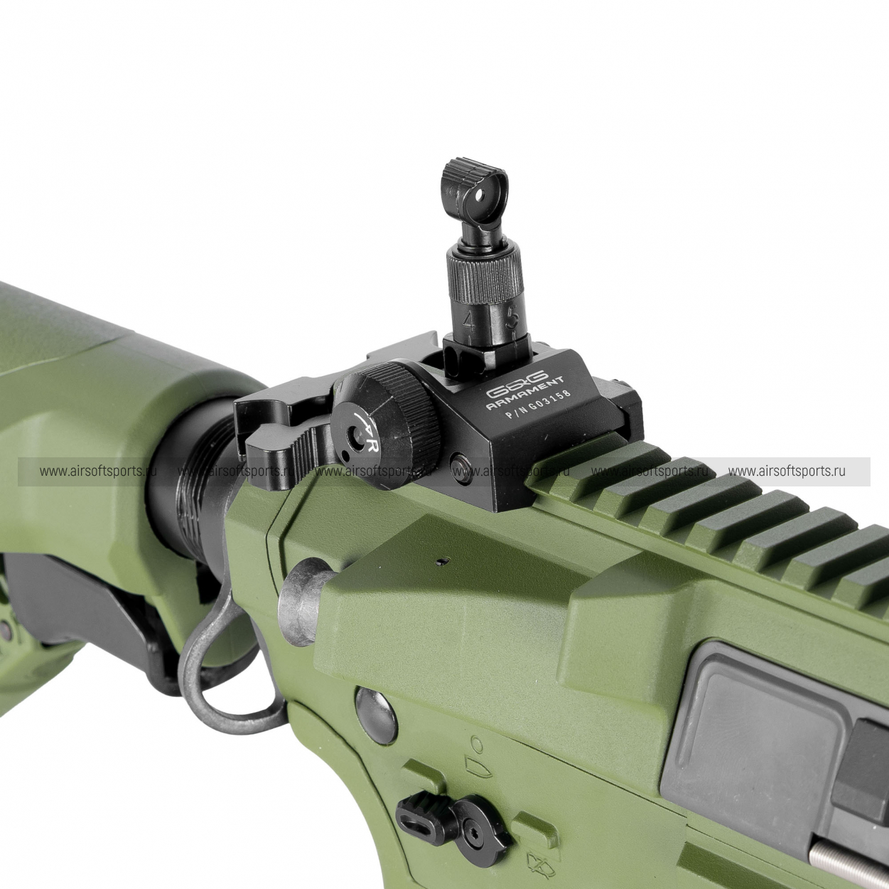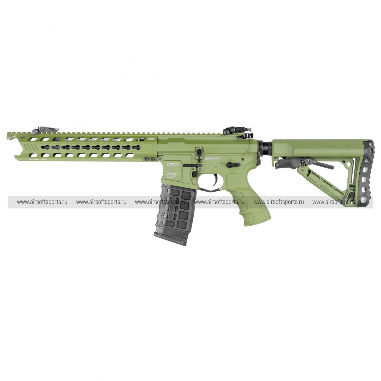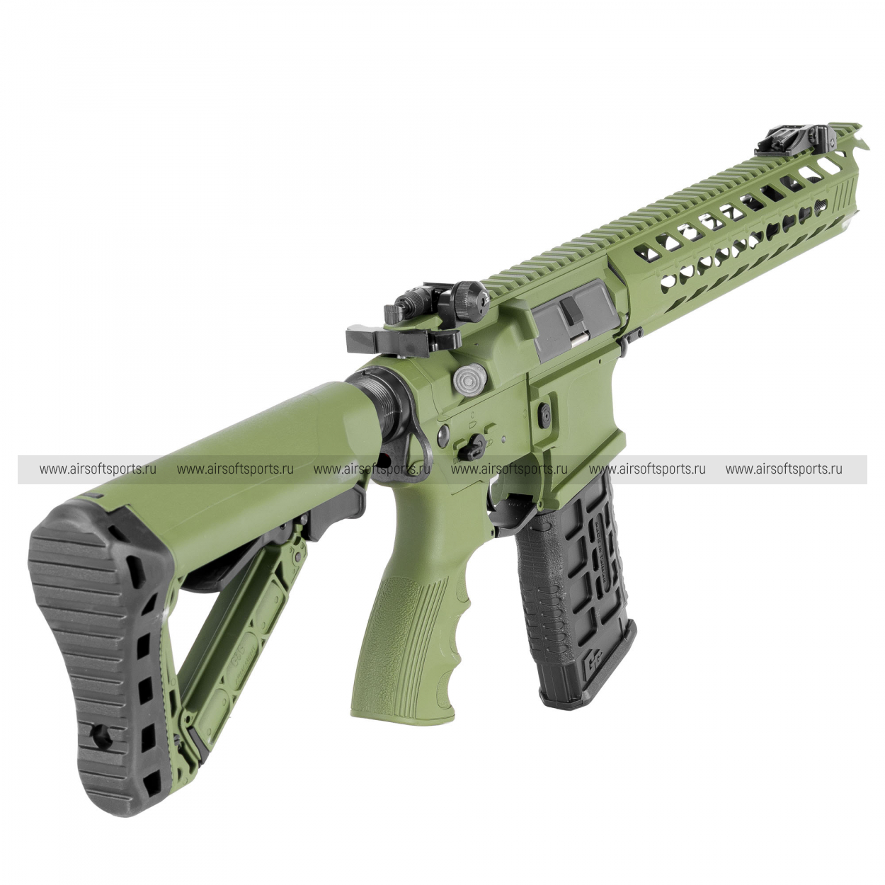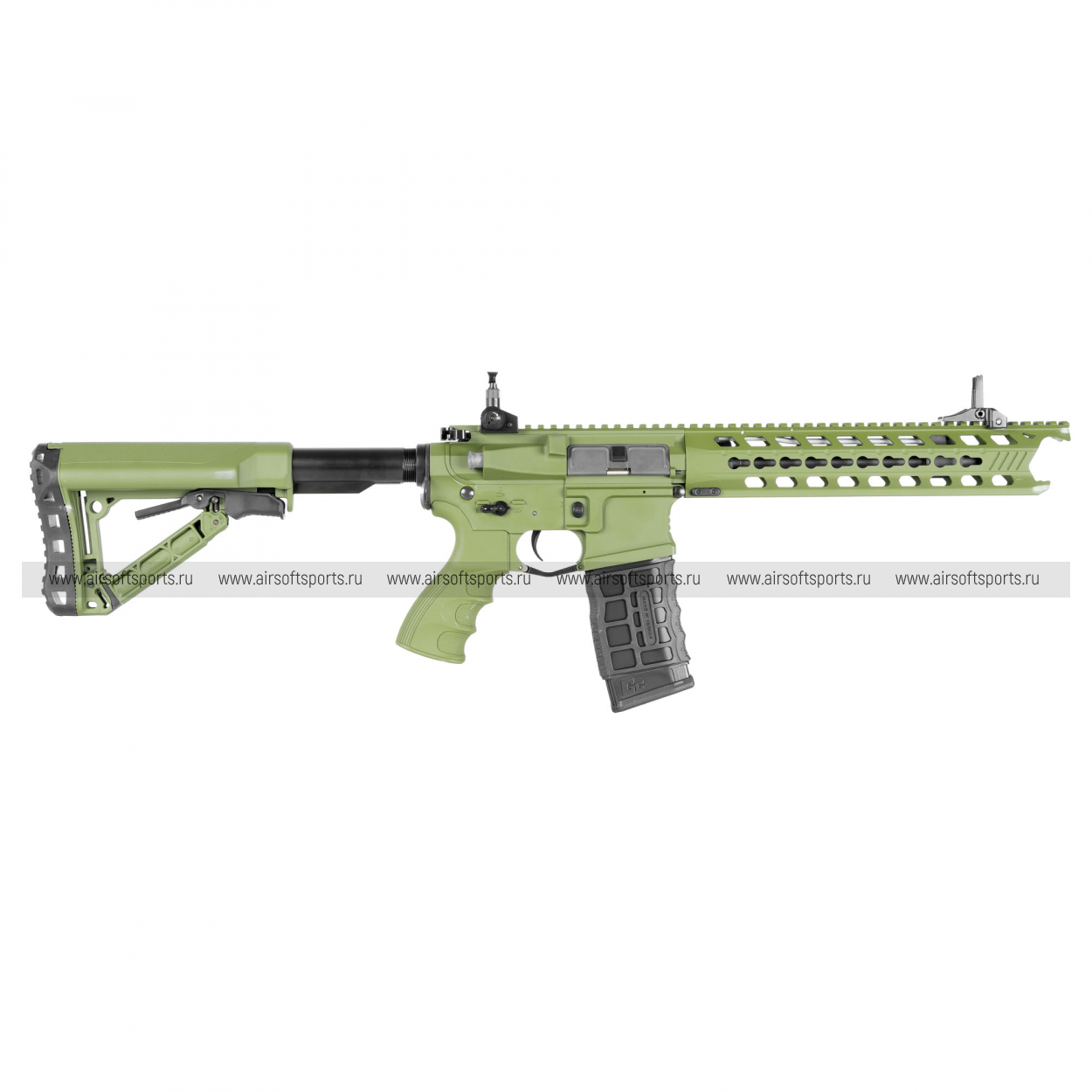 GC16 Predator выглядит современно, агрессивно и очень технологично. Длинное облегчённое цевьё с крупными продолговатыми прорезями делает силуэт вытянутым, легким и динамичным, а верхняя планка по всей длине корпуса визуально объединяет конструкцию в цельный профиль. Складные механические прицельные приспособления аккуратно дополняют общий образ, а характерные формы цевья и его передней части добавляют модели более выразительный и почти кастомный внешний вид. Телескопический приклад с облегчённой конструкцией, эргономичная пистолетная рукоять с рельефом под пальцы и магазин в современном стиле AR-платформы завершают образ. В целом привод смотрится стильно, функционально и заметно выделяется среди более классических вариантов.