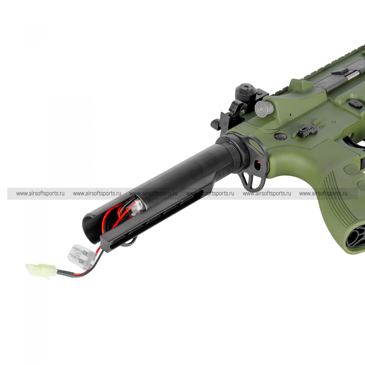 Отсек для аккумулятора находится в телескопическом прикладе. Конструкция приклада специально оптимизирована для удобного размещения двух- или трехлепестковых Li-Po аккумуляторов.