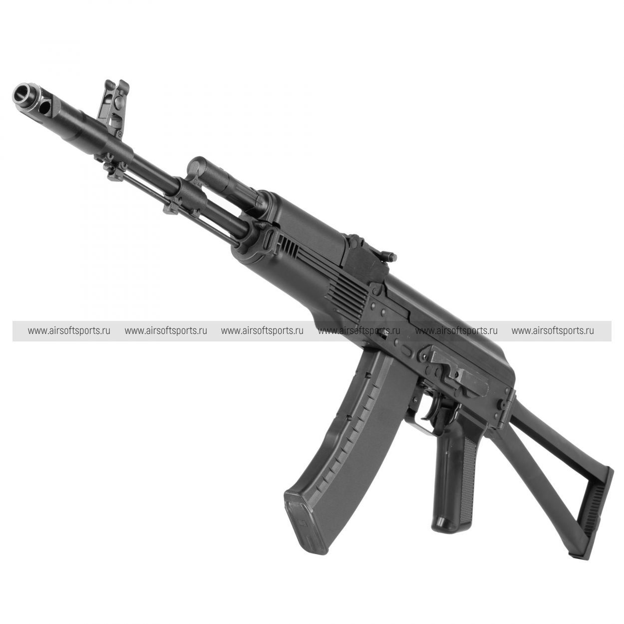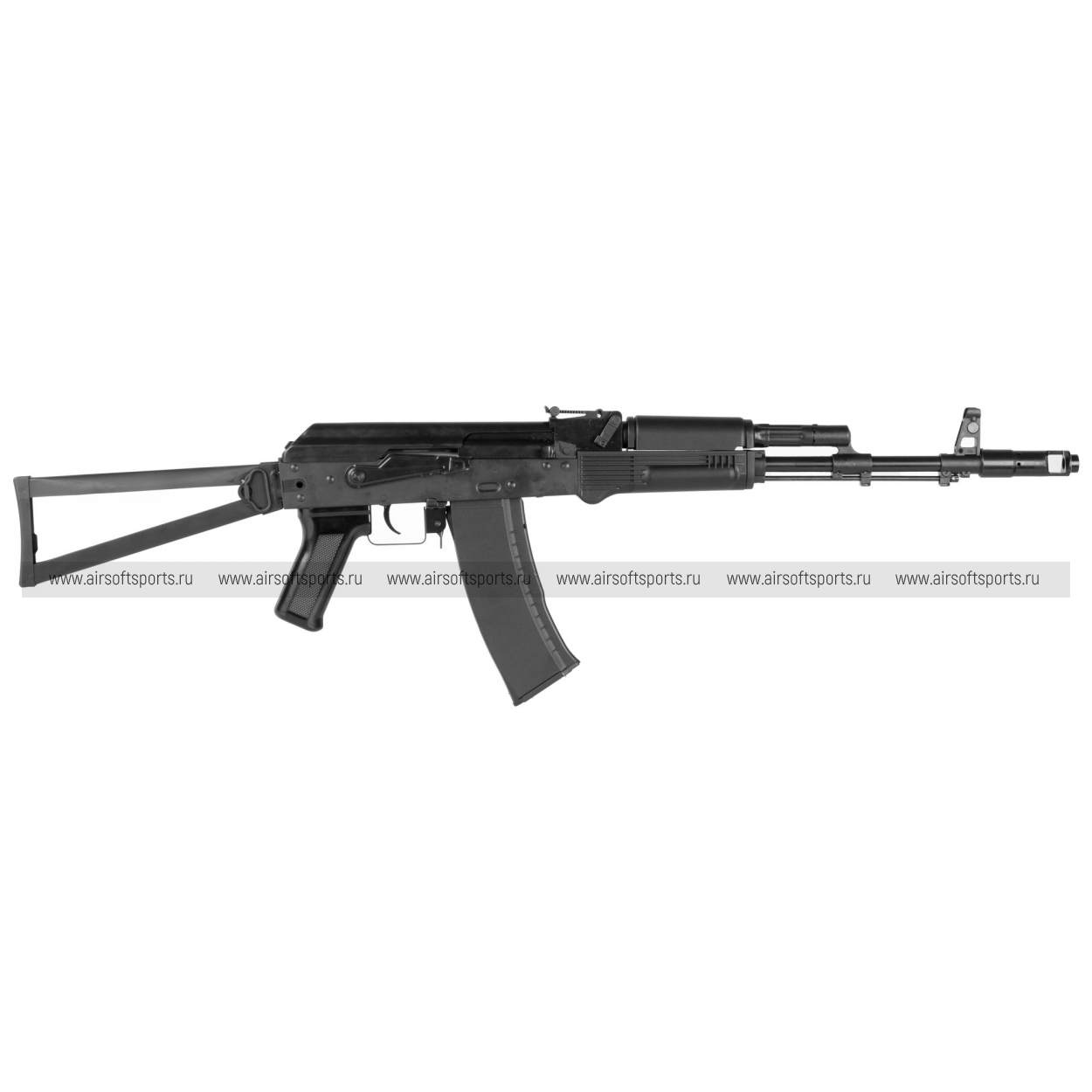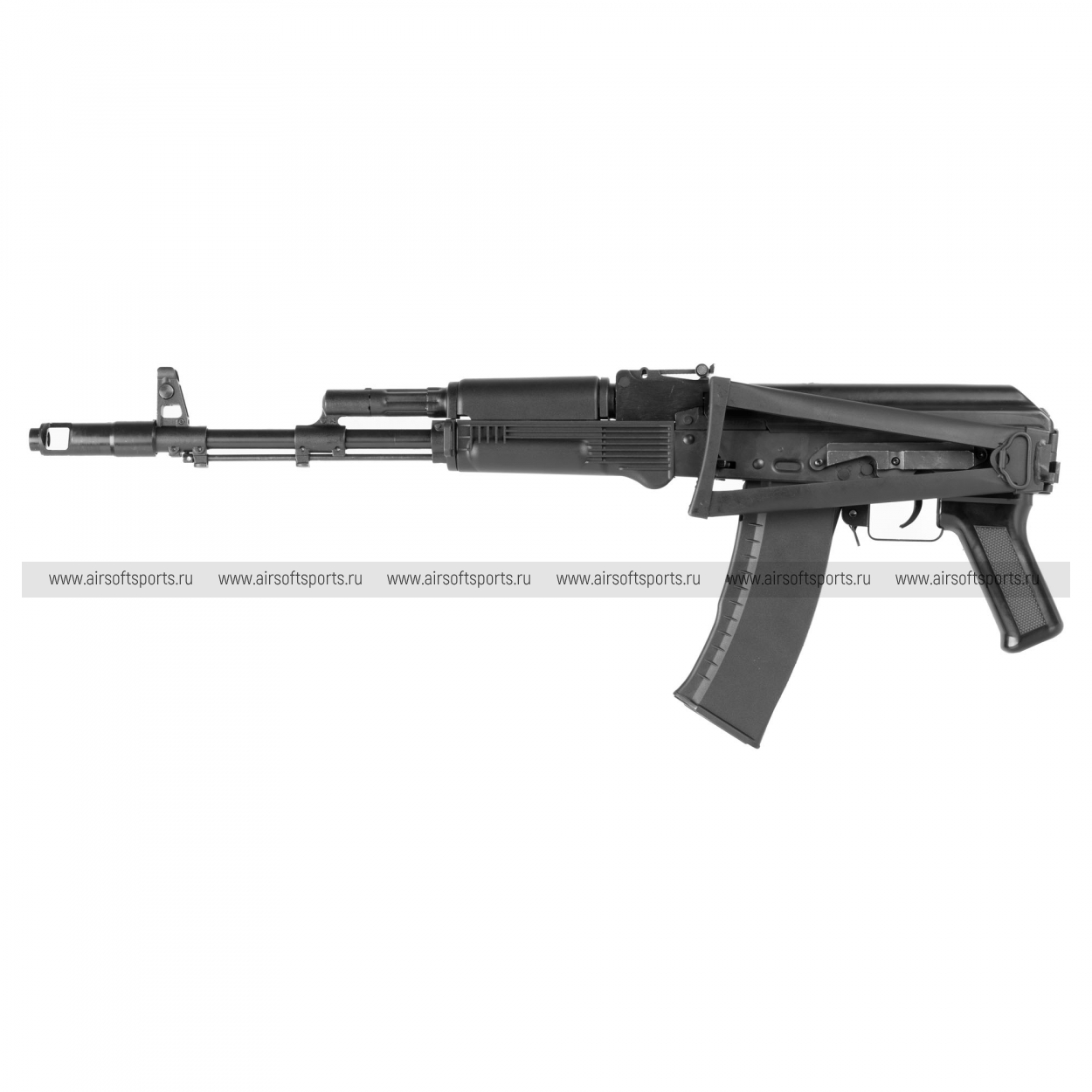 GKSG74 ETU сохраняет традиционный и легко узнаваемый облик семейства АК-74. Черное исполнение делает модель строгой и универсальной, а длинная передняя часть с классическим пламегасителем подчеркивает ее силуэт. Отдельное внимание привлекает металлический складной приклад рамочного типа, который добавляет реплике характерный армейский стиль. Компактное цевьё, прямая крышка ствольной коробки, классическая пистолетная рукоять и изогнутый магазин формируют цельный образ, в котором сочетаются простота, функциональность и узнаваемая эстетика АК-платформы.