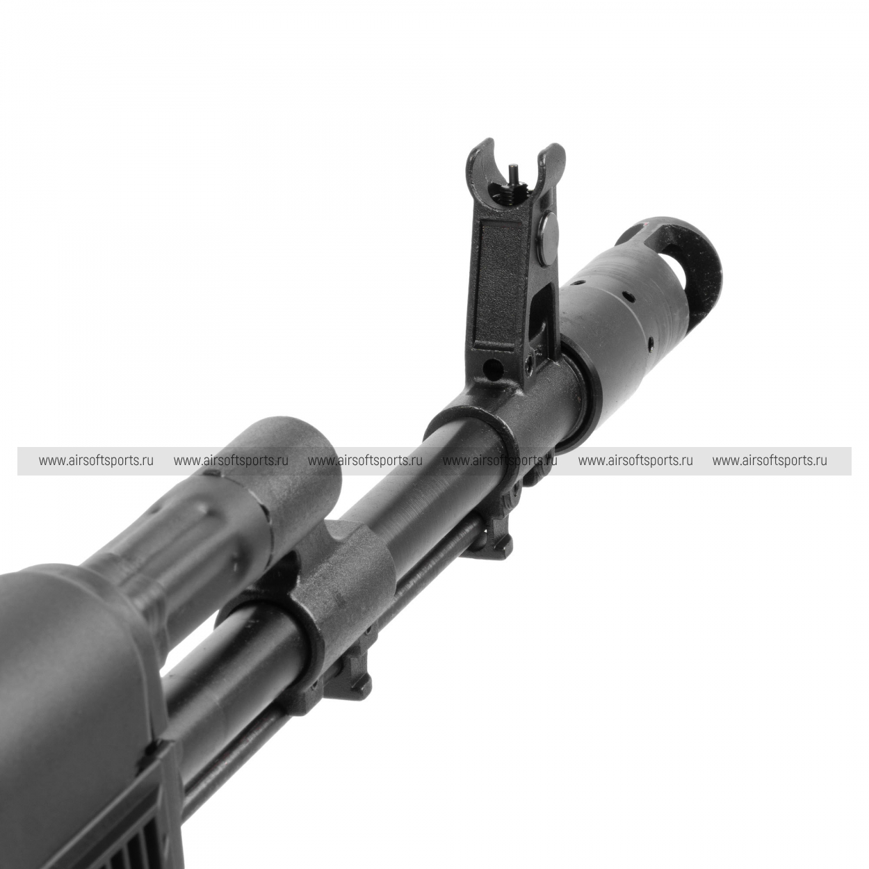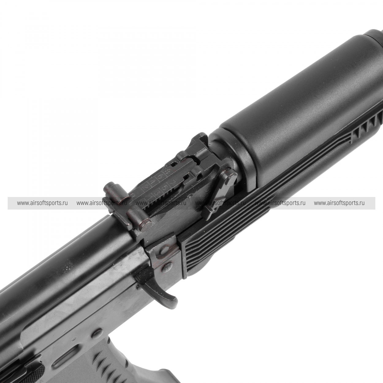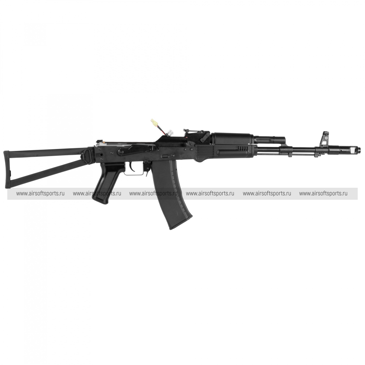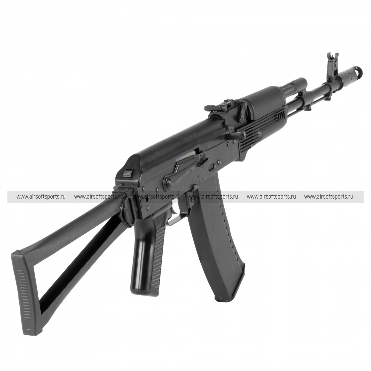 GKSG74 ETU сохраняет традиционный и легко узнаваемый облик семейства АК-74. Черное исполнение делает модель строгой и универсальной, а длинная передняя часть с классическим пламегасителем подчеркивает ее силуэт. Отдельное внимание привлекает металлический складной приклад рамочного типа, который добавляет реплике характерный армейский стиль. Компактное цевьё, прямая крышка ствольной коробки, классическая пистолетная рукоять и изогнутый магазин формируют цельный образ, в котором сочетаются простота, функциональность и узнаваемая эстетика АК-платформы.