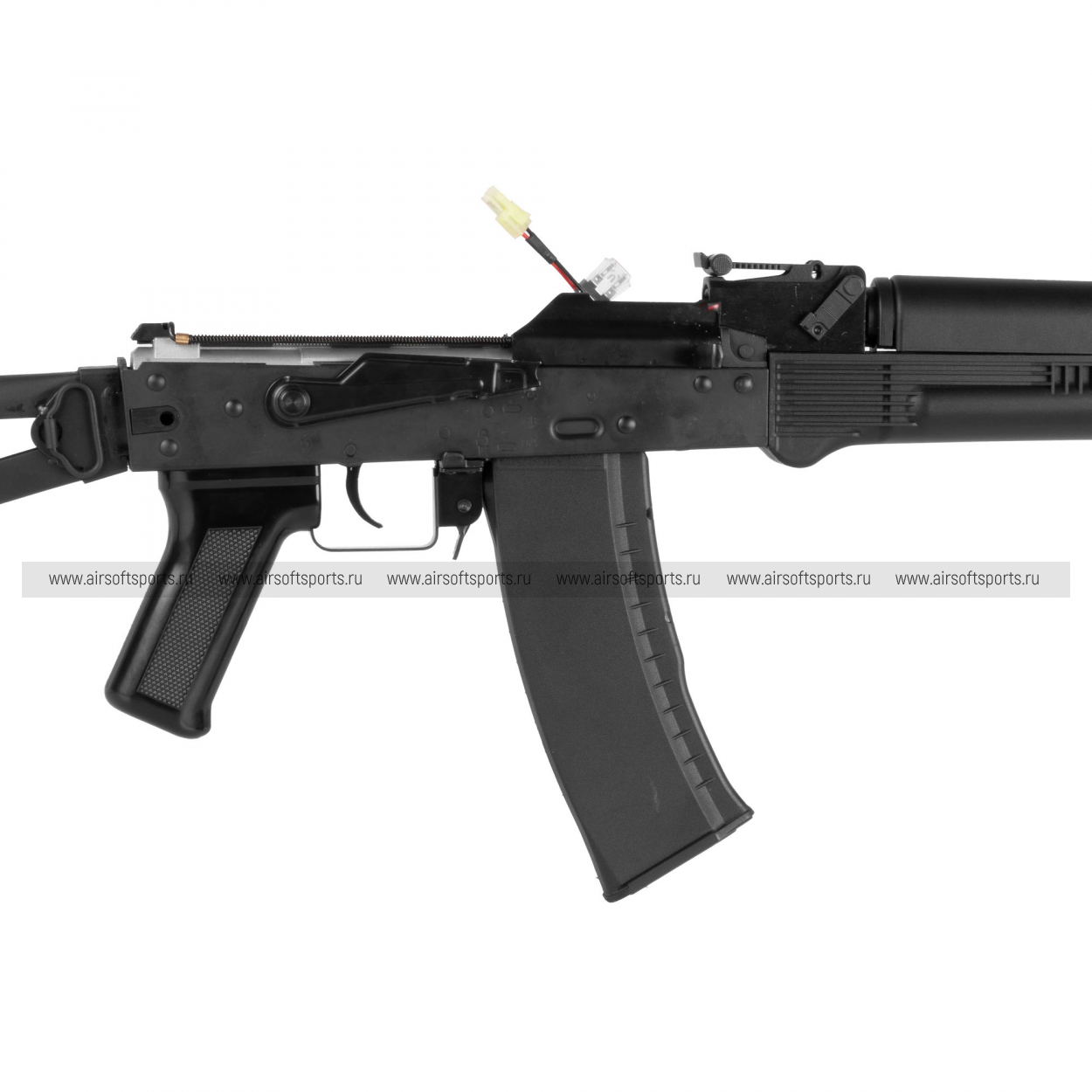 Отсек для аккумулятора находится под крышкой ствольной коробки. Внутри достаточно свободного места для установки стандартных аккумуляторов с разъемом Мини-Тамия. Одного заряда аккумулятора хватает на несколько часов работы.