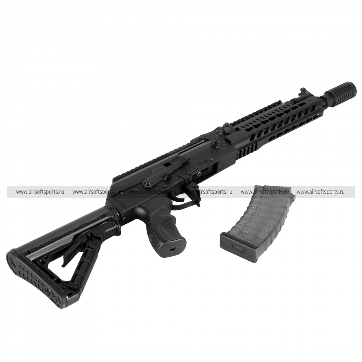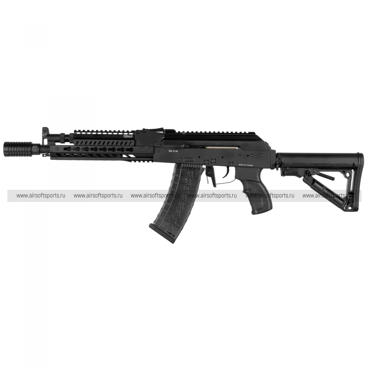 RK74-E выглядит агрессивно, современно и очень практично. Основа классического силуэта AK здесь дополнена длинным тактическим цевьём с многочисленными вентиляционными окнами и планками, что делает переднюю часть более выразительной и функциональной. Верхняя линия корпуса с установленной планкой визуально вытягивает профиль, а телескопический приклад в стиле AR заметно меняет восприятие модели, придавая ей более современный и штурмовой характер. Изогнутый полупрозрачный магазин сохраняет узнаваемую эстетику платформы AK, а эргономичная пистолетная рукоять и массивное дульное устройство завершают образ. В целом привод смотрится как удачное сочетание классической базы и актуального тактического тюнинга.