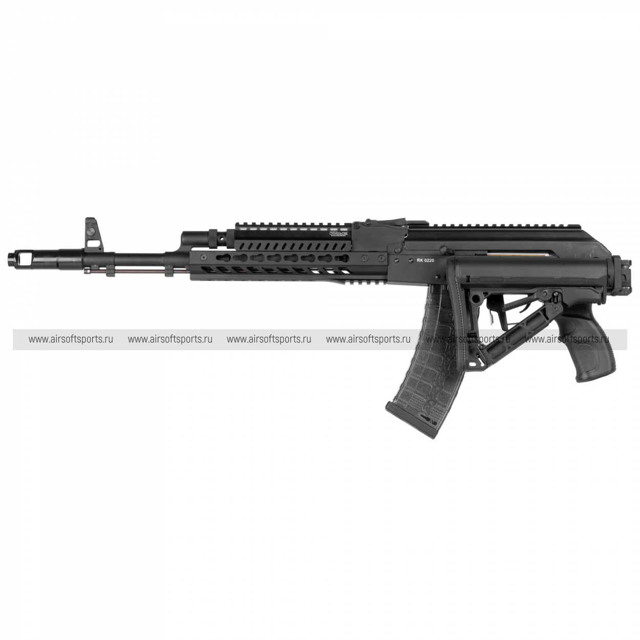RK74-T выглядит как модернизированная тактическая версия классического АК. Полностью черное исполнение делает образ строгим и практичным, а длинная передняя часть придает модели более вытянутый и серьезный силуэт. Облегчённое цевьё с прорезями и планками визуально добавляет приводу современности, верхняя планка на крышке ствольной коробки подчеркивает его тактический характер, а телескопический приклад в стиле AR делает внешний вид более универсальным и актуальным. Изогнутый магазин сохраняет узнаваемый АК-облик, благодаря чему модель удачно сочетает классические черты и современные элементы тюнинга.